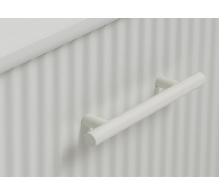 Vrchná doska je obdĺžniková a prednú časť tvorí trojdielna fasáda s výrazným vertikálnym rebrovaním, ktoré prináša do dizajnu art deco nádych. Bočné diely tvoria dve jednodverové skrinky s úložným priestorom v plnej výške s otvorom na vedenie káblov na zadnej strane. Stredný diel je horizontálne predelený na polovicu, pričom spodnú časť vypĺňa zásuvka a vrchnú polica s otvorenou zadnou stenou. Stolík tak ponúka praktický úložný priestor nielen na osobné predmety, ale aj na elektronické príslušenstvo. Otváranie je riešené pomocou lineárnych kovových úchytiek a ostatné plochy zostávajú hladké, čím vyniká čistota celkového spracovania.