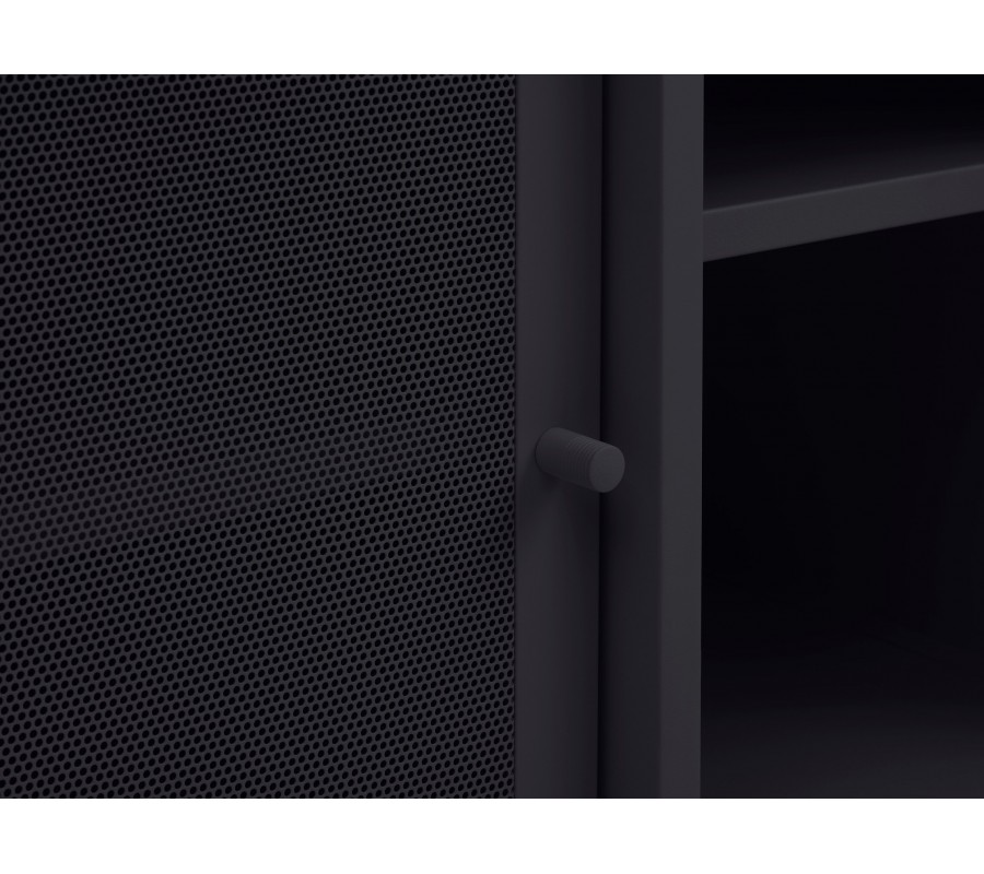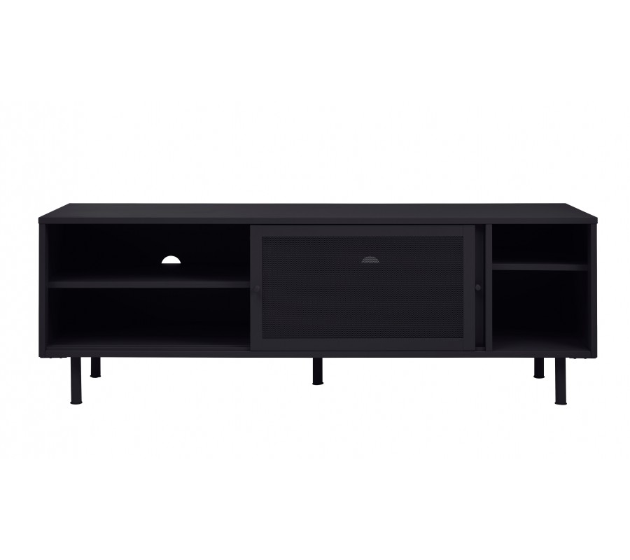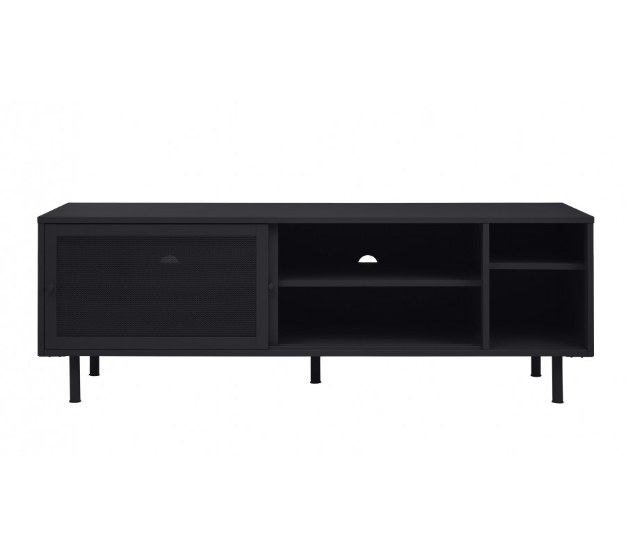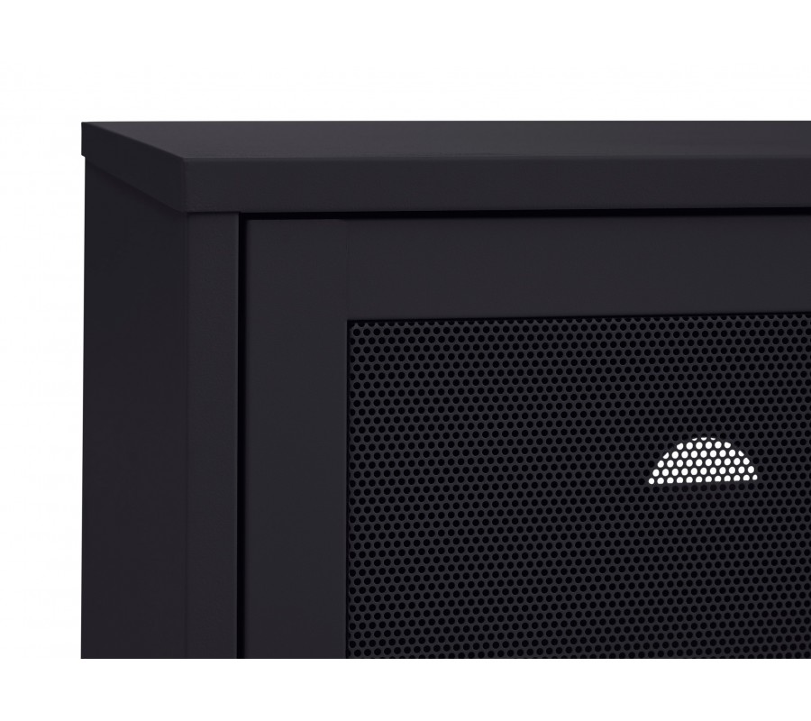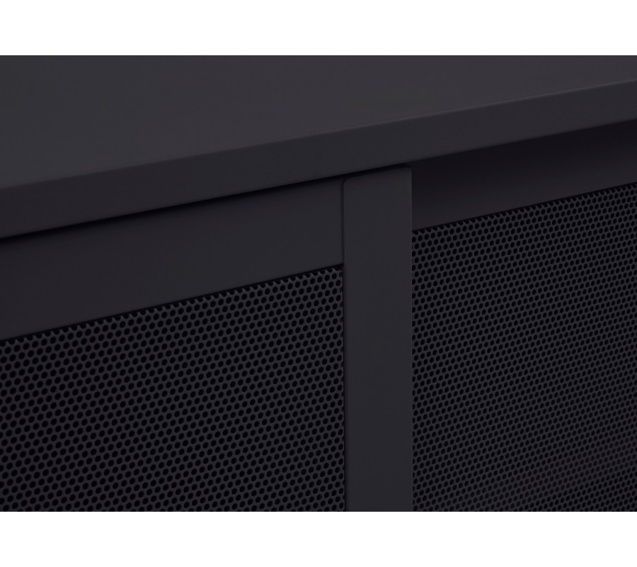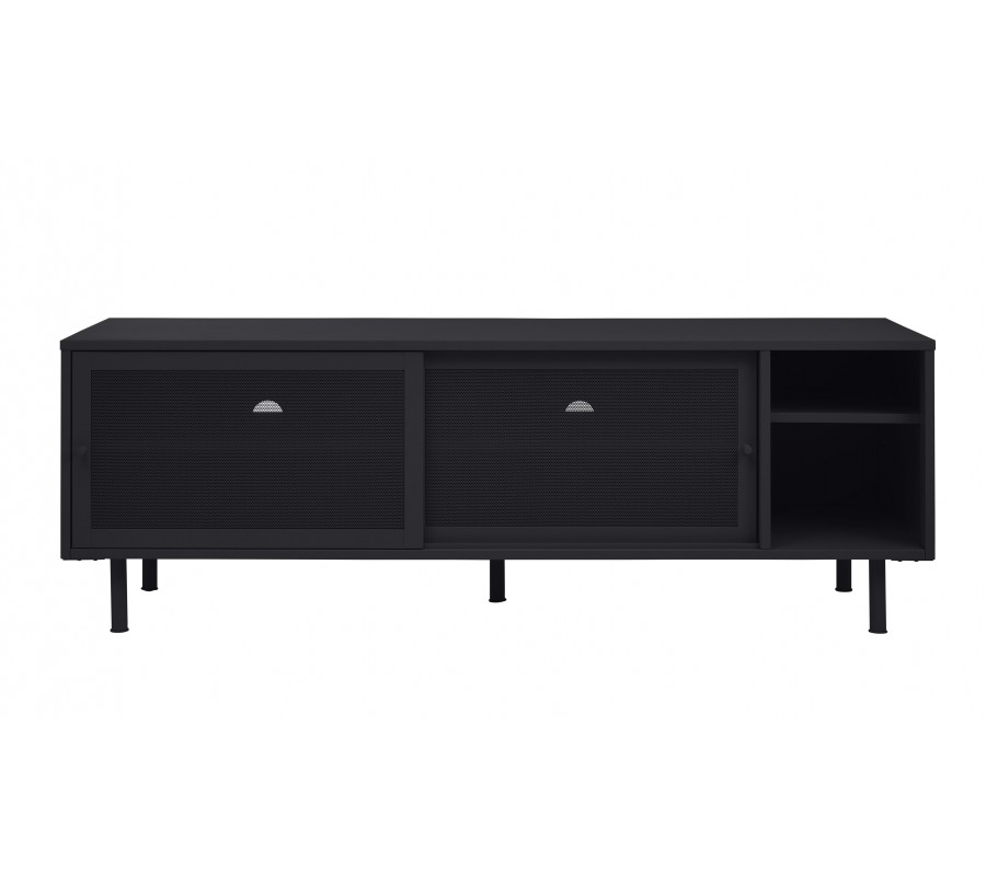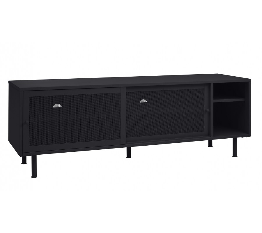 Industriálny TV stolík Vejle z kovu v čiernej farbe s policami a dvomi posuvnými perforovanými dvierkami 160 cm