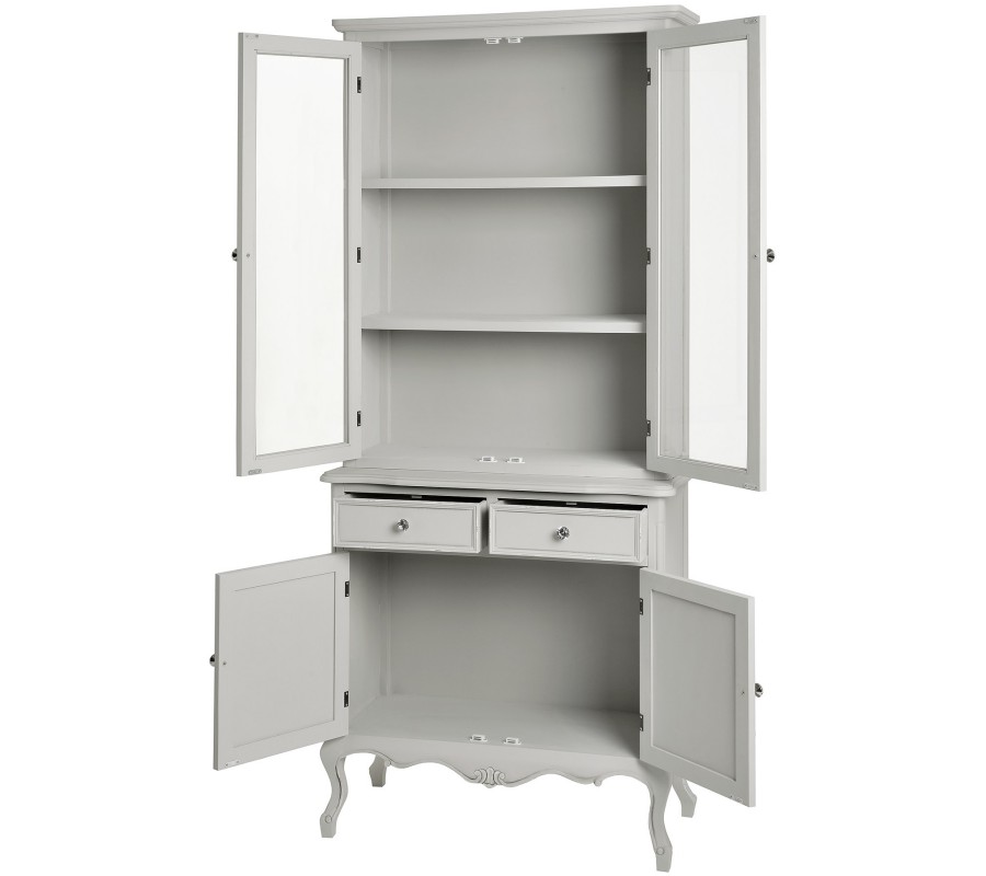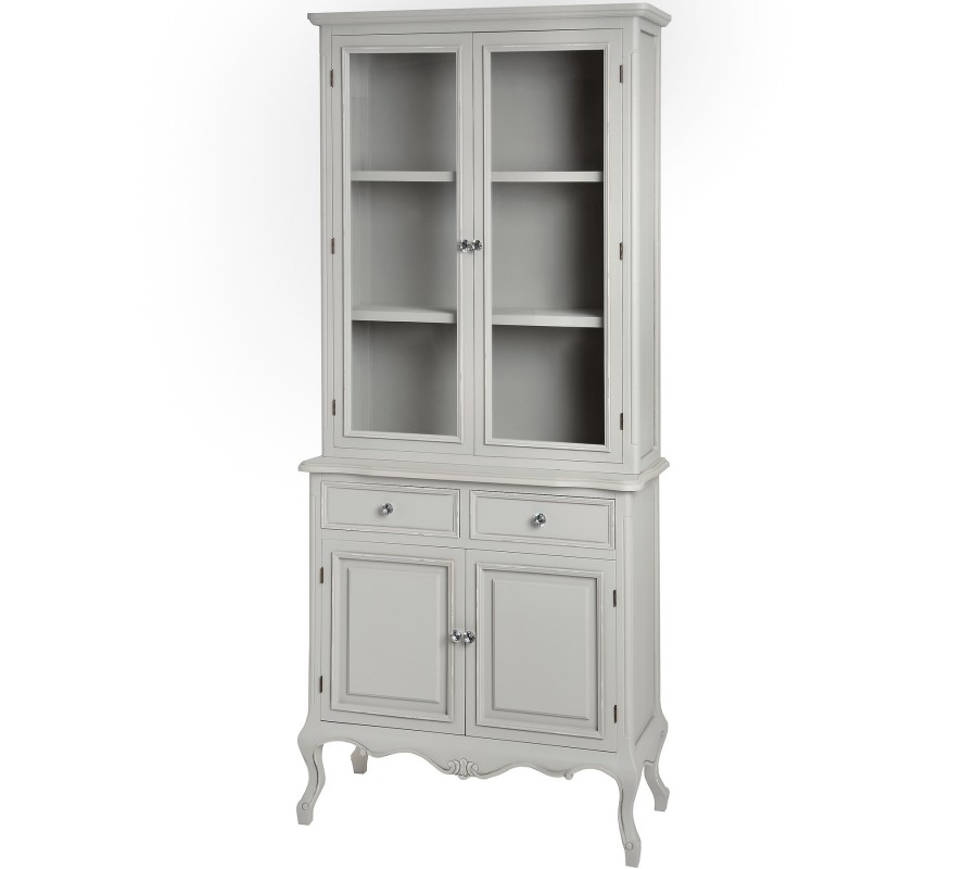 Štýlová vitrína z kolekcie FLEUR s typickými prvkami francúzskeho vidieku v jemnej sivej farbe sa obzvlášť hodí do farebnejších miestností kde dokáže výborne vyniknúť. Zaujímavým doplnkom sú madlá na zásuvkách alebo skrinkách v podobe krištálových gombíkov ale aj ozdobné lemovanie pozdĺž okrajov nábytku.