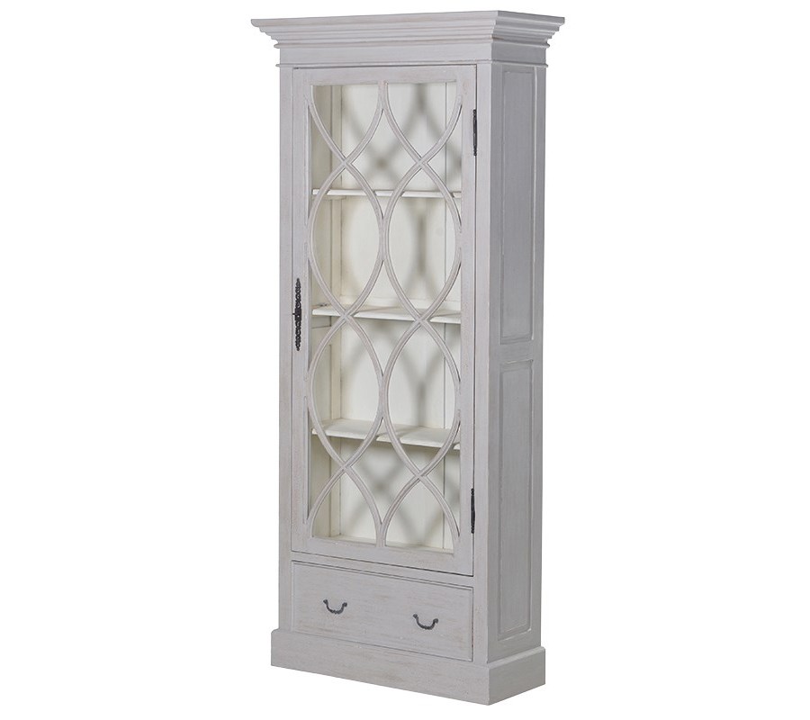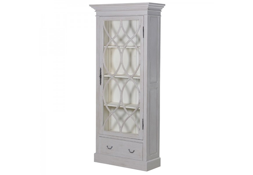 Úložný priestor pozostáva zo skrinky so štyrmi policami, kde môžete vďaka preskleným dvierkam vystaviť vaše obľúbené dekorácie či knihy, ktoré budú zároveň chránené pred prachom. Oceníte tiež zásuvku v spodnej časti, ktorá vám poskytne uzavretý priestor na dôležité drobnosti. Zásuvka sa otvára pomocou dvoch visiacich kovových úchytiek v tmavej farbe. Z rovnakého materiálu je zhotovená aj úchytka na dvierkach doplnená o dlhé kované ornamentálne zdobenie.