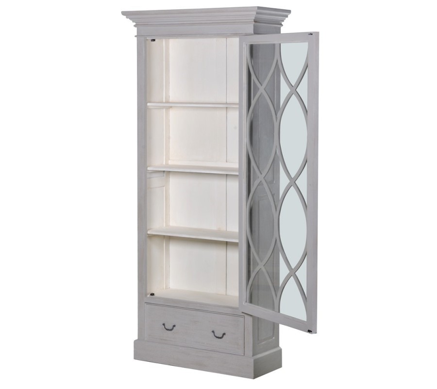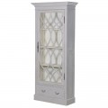 Vitrína je vyrobená z mahagónového dreva, ktoré je veľmi tvrdé a odolné. Povrch pokrýva sivý náter s takzvaným washed efektom vymytej farby, ktorý prináša do dizaju nádych vintage štýlu. Interiér skrinky je biely, čo pomôže zvýrazniť vystavené predmety. Výplň dvierok je taktiež veľmi pevná, zhotovená z bezpečnostného skla.
