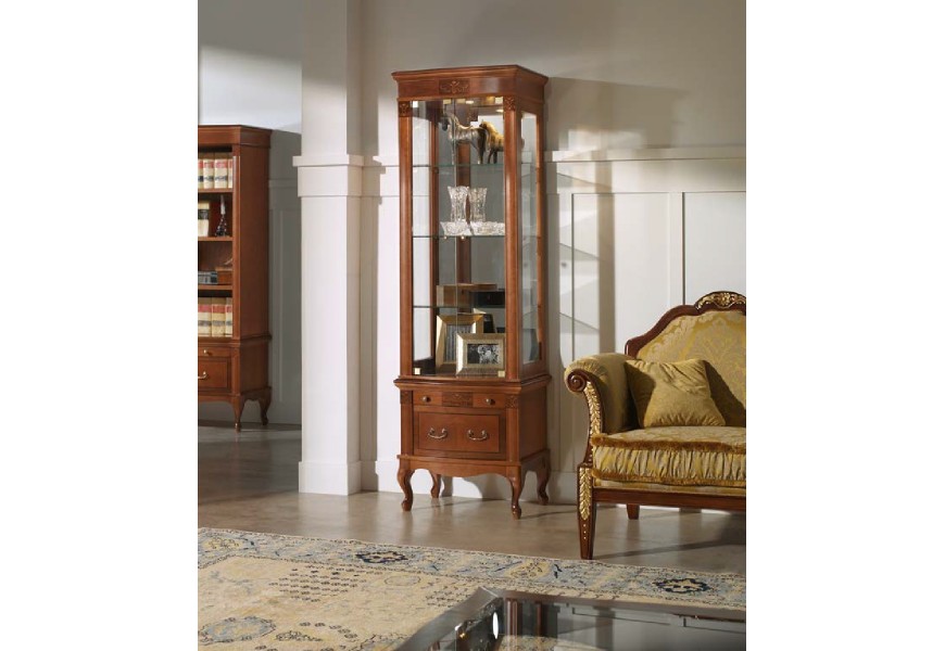 Luxusná masívna vitrína na nožičkách CASTILLA svojim vzhľadom učarí najmä fanúšikom rustikálneho či barokového štýlu. Okrem množstva úložného priestoru v podobe otvorených presklených priečok, zásuvky a skrinky, ponúka naozaj očarujúci a pútavý vzhľad. Ručne vyrábané ozdobné prvky sú vo variantoch Čerešňa a Orech zhotovené technikou marketérie, čo z vitríny robí naozaj jedinečný kúsok. Celá konštrukcia je vyhotovená z kvalitného masívu bukového dreva a rovnako ako všetok nábytok tejto kolekcie, môže byť prevedená v štyroch farebných variantoch podľa vzorkovníka. Produkt na fotografií je vo farebnom prevedení orech.