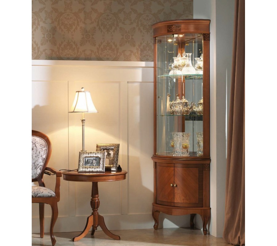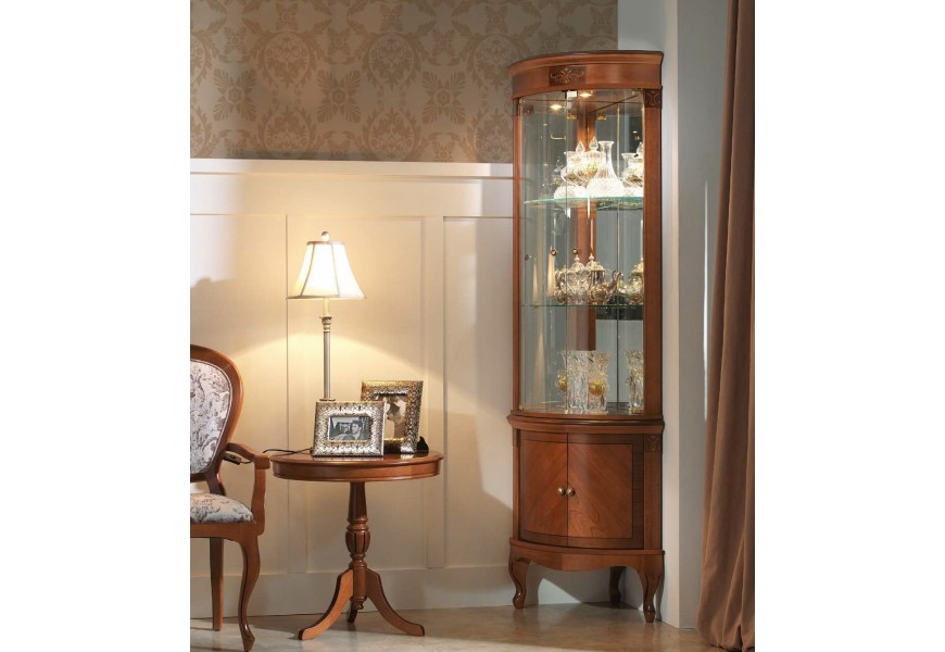 Exkluzívna rohová vitrína CASTILLA II je predstaviteľom nadčasového rustikálneho nábytku vysokej kvality. Základná konštrukcia zhotovená z kvalitného masívu bukového dreva je vo farebnej variante Čerešňa a Orech doplnená o ozdobné prvky vytvorené vkladaním drobných častí z dreva odlišného odtieňa do povrchu (tzv. technikou marketérie). V spodnej časti vitrínu dopĺňa praktický uzavretý úložný priestor. Rovnako ako všetok nábytok kolekcie CASTILLA, je možné aj tento kúsok vyhotoviť v štyroch farebných prevedeniach. Produkt na fotografií je vo farebnom prevedení orech.