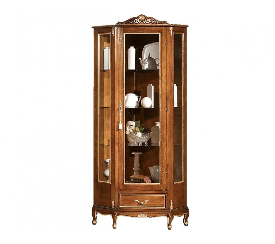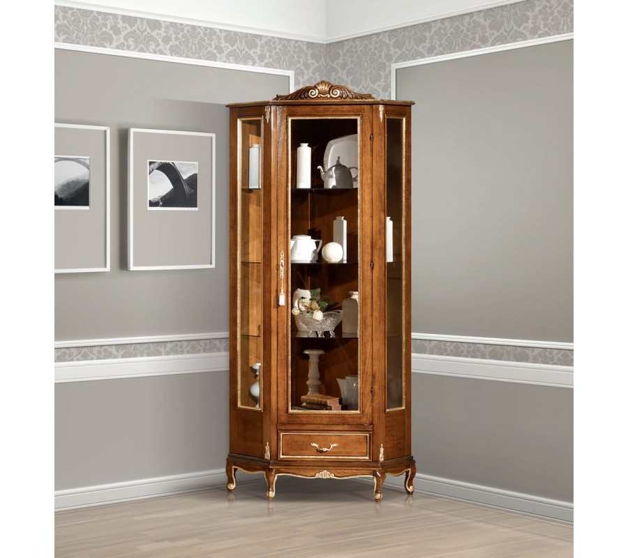 klasická rohová vitrína z našej jedinečnej kolekcie talianskeho nábytku Emociones vás zaručene už na prvý pohľad uchváti svojím elegantným dizajnom. Vitrína je vyrobená z kvalitného dreveného masívu, ktorý sa vďaka precíznej ručnej úprave premenil na skvost, ktorý sa poľahky stane stredobodom akéhokoľvek interiéru. Celkový masívny dojem vitríny je zjemnený vyrezávanou výzdobou na vrchnej i spodnej časti vitríny, ktorej luxusný vzhľad je umocnený zlatou farbou, ladiacou s kovovými úchytkami dvierok a zásuvky, ktoré v kombinácii s vyrezávanými chippendale nožičkami vytvárajú pravú zámockú atmosféru. Vitrína je nie len peknou ozdobou, ale aj praktickým spoločníkom, keďže ponúka dostatok úložného priestoru, či už v podobe štyroch priestranných sklenených poličiek, na vystavenie vašich vzácností, alebo v podobe zásuvky nachádzajúcej sa v spodnej časti vitríny. Vitrínu odporúčame najmä milovníkom histórie, hradov a zámkov, keďže vďaka svojmu starožitnému barokovému vzhľadu u vás vyčarí pravú historickú atmosféru.
