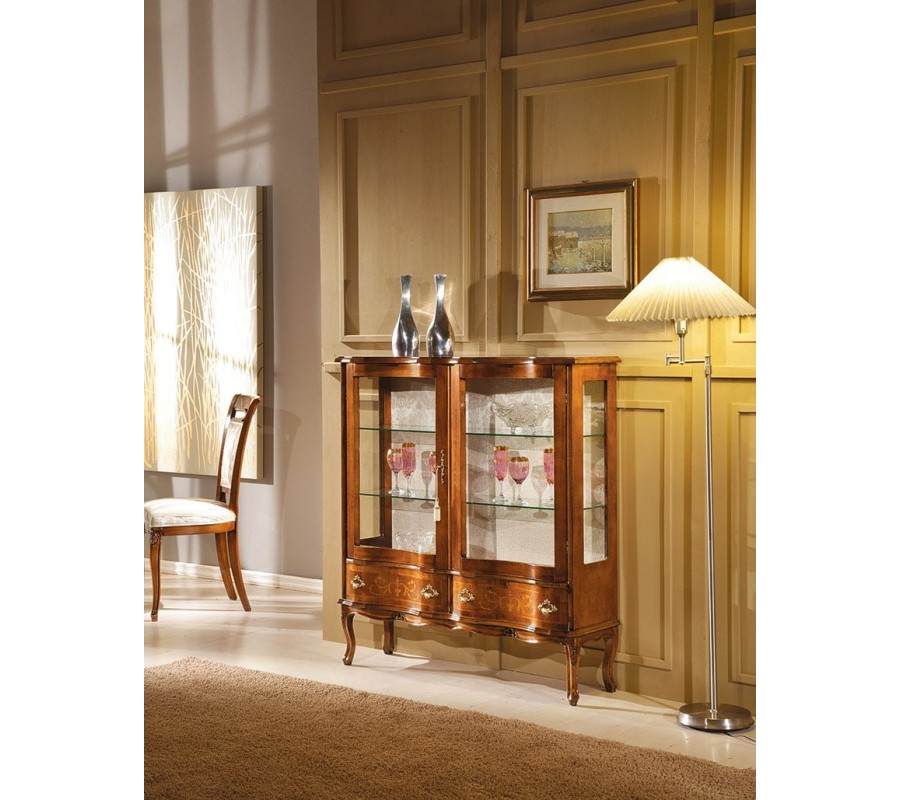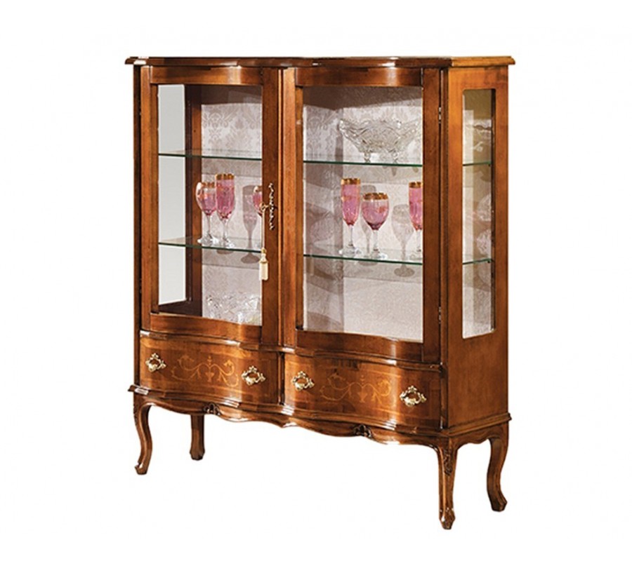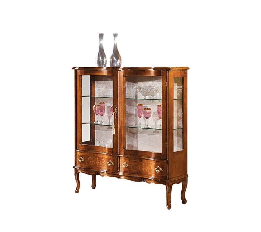 Luxusná vitrína z jedinečnej kolekcie Clásica je kúskom vhodným na doplnenie rustikálne, barokovo či klasicky ladených honosných obývačiek. Táto luxusná dvojdverová vitrína z kolekcie talianskeho nábytku je vyrobená z kvalitného masívneho dreva, ktoré zdobí precízne ručné vyrezávanie. Jej dominantnými prvkami sú elegantné oblé línie, nožičky v štýle chippendale a precízne ručné vyrezávanie, ktoré vytvárajú krásny starožitný vzhľad. Na fotkách môžete vidieť hnedé farebné prevedenie masívu s ornamentálnym gravírovaním v kombinácii so starou zlatou farbou. Luxusná vitrína disponuje dvomi zásuvkami a šiestimi sklenenými poličkami, kde si môžete vystaviť svoje dekorácie, keramické čajové sety, či krištáľové poháre. Dvierka vitríny sú sklenené, tým pádom uchránia vaše vzácnosti pred znehodnotením a prachom. Vybrať si môžete z viacerých prevedení dreva aj rukovätí zo vzorkovníka, vďaka čomu si môžete vitrínu prispôsobiť podľa potrieb vašej miestnosti a vlastného vkusu.