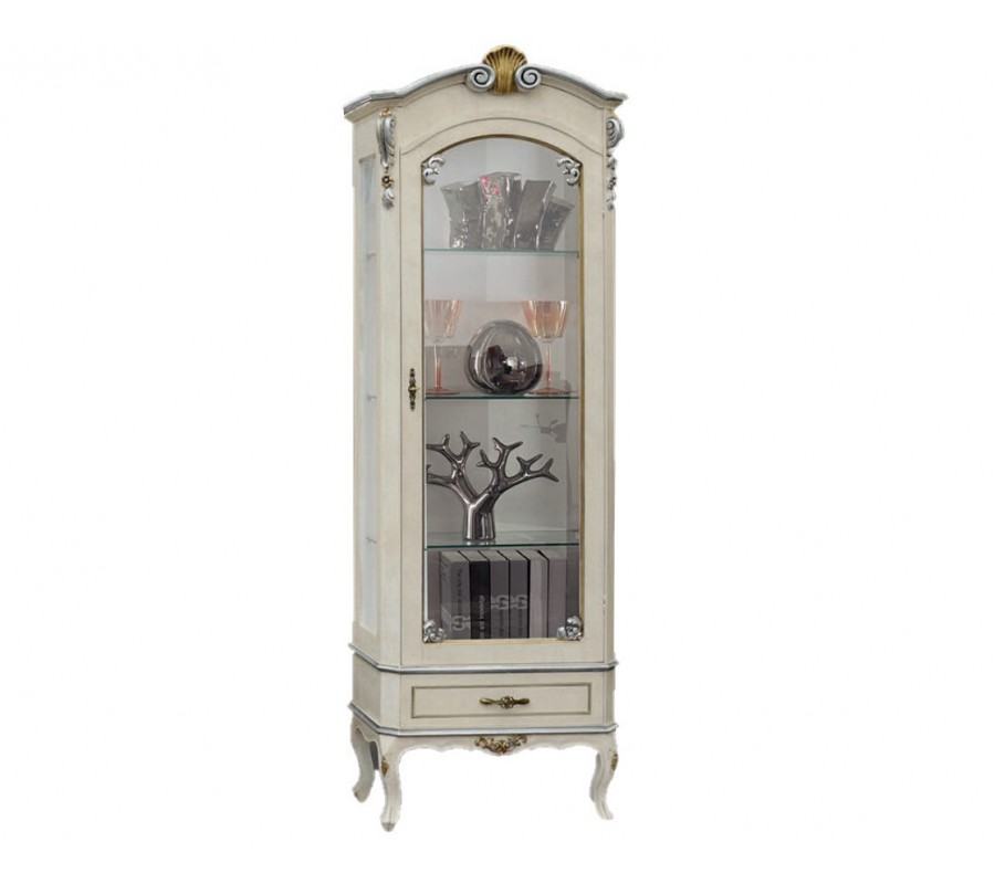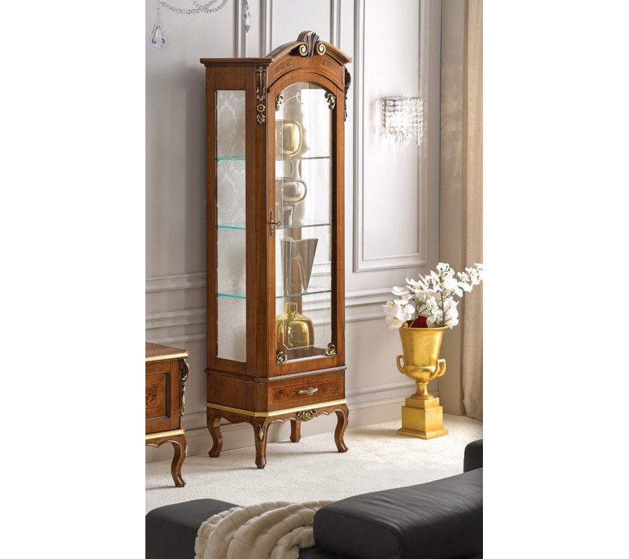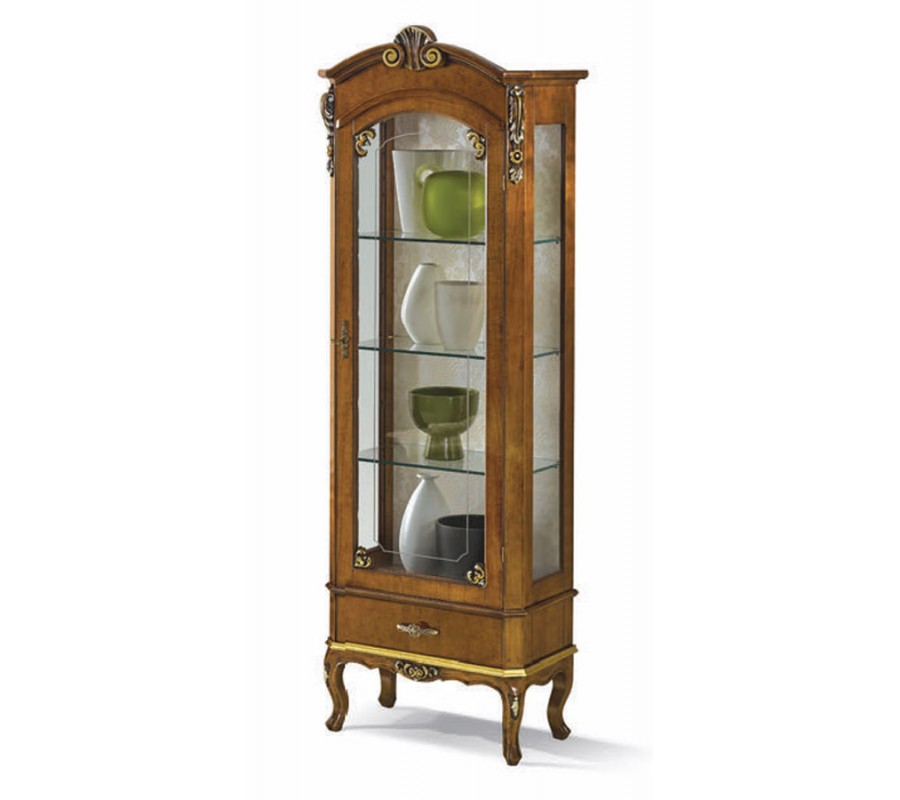 Luxusná klasická vitrína Clásica zaujme najmä milovníkov rustikálneho a barokového štýlu. Je vyrobená z kvalitného masívneho dreva, ktoré zdobia ručne vyrezávané ozdobné prvky. Disponuje úložným priestorom v podobe zásuvky v spodnej časti štyrmi sklenenými poličkami so sklenenými dvierkami,ktoré sú ideálnym miestom na vystavenie vašich čajových setov čiiných dekorácií. Celkový dizajn vitríny dopĺňajú zaoblené vyrezávané nožičky v štýle chippendale a ozdobné kovové úchyty na dvierkach a zásuvke. Vďaka možnosti výberu farebného prevedenia dreva aj úchytov si môžete vytvoriť skutočne originálny kúsok presne podľa potrieb vášho interiéru. Vitrína Clásica zapadne predovšetkým do barokovo, rustikálne či klasicky ladených obývačiek alebo jedální v kombinácii s ďalšími kúskami z našej rovnomennej luxusnej kolekcie.