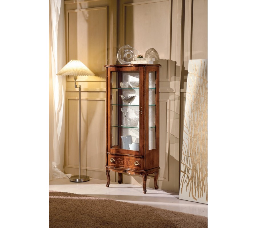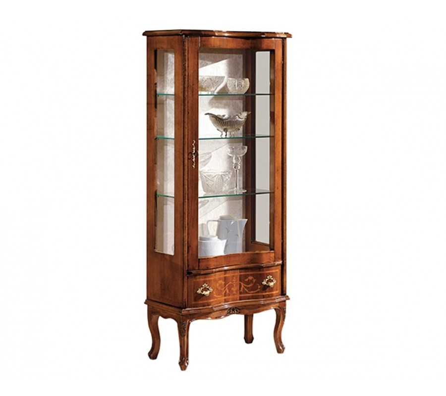 Luxusná klasická vitrína z talianskej kolekcie Clásica osloví každého milovníka rustikálneho a barokového štýlu svojim jedinečným dizajnom. Vitrína je vyrobená z kvalitného masívneho dreva, ktoré zdobia ručne vyrezávané originálne prvky a taktiež ornamentálne gravírovanie do dreva. Celkový dizajn vitríny dopĺňajú nožičky v štýle chippendale a obohacujú ju aj ozdobné kovové úchytky, ktoré sa nachádzajú na zásuvke a na dvierkach. Luxusná vitrína disponuje štyrmi sklenenými poličkami, kde si môžete vystaviť svoje dekorácie, keramické čajové sety, či krištáľové poháre. Dizajn vitríny taktiež dotvárajú praktické sklenené dvierka, ktoré uchránia vaše vzácnosti pred znehodnotením a prachom. Na fotkách môžete vidieť hnedé farebné prevedenie masívu v kombinácii so starou zlatou farbou. Farebné prevedenie príborníka a kovových úchytiek si môžete zvoliť podľa potreby a vlastného vkusu z nášho vzorníka. Vitrínu môžete umiestniť do honosnej obývačky zariadenom s našimi ďalšími nábytkami z kolekcie Clásica.