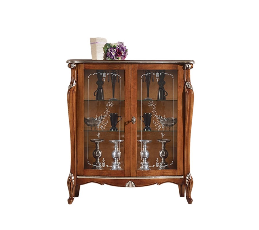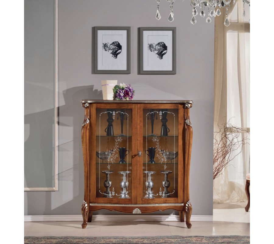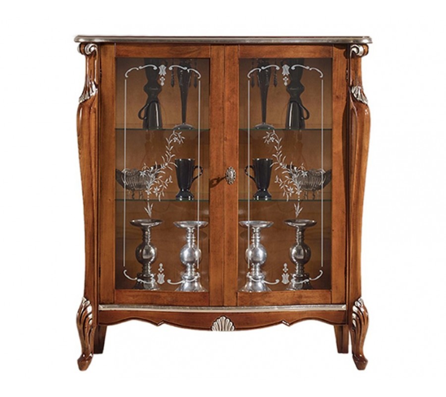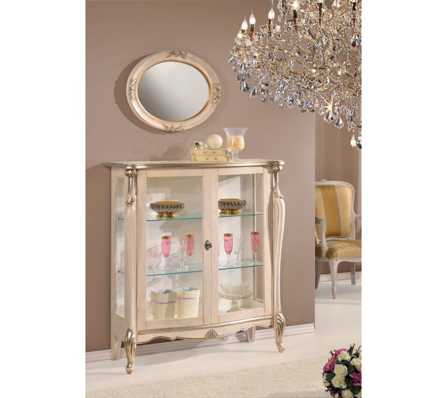 Exkluzívna baroková vitrína Pasiones je nádherným príkladom jedinečnosti svojho štýlu najmä vďaka dômyselnému využitiu dreva zdobeného aplikáciami striebornej farby. Jedinečná vitrína Pasiones je vyrobená z masívneho dreva, ktorého povrchová farba je voliteľná a teda je veľmi jednoduché nájsť ten pravý kúsok do už existujúceho a čiastočne zariadeného interiéru. Vitrína Pasiones je postavená na jemne oblých nožičkách, ktoré v interiéri docieľujú vzdušnejší vzhľad i takéhoto masívneho kúsku. Vitrína Pasiones Vám poskytne dostatok úložného priestoru na Vaše vkusné dekorácie či vzácny porcelán na troch priestranných sklenených policiach. Luxusnú vitrínu Pasiones odporúčame kombinovať v rámci štýlovo obdobných obývačiek, predsiení, kancelárií či reprezentatívnych priestoroch firiem so striebornými dekoráciami a luxusnými materiálmi ako koža a srsť s dlhším vlasom.