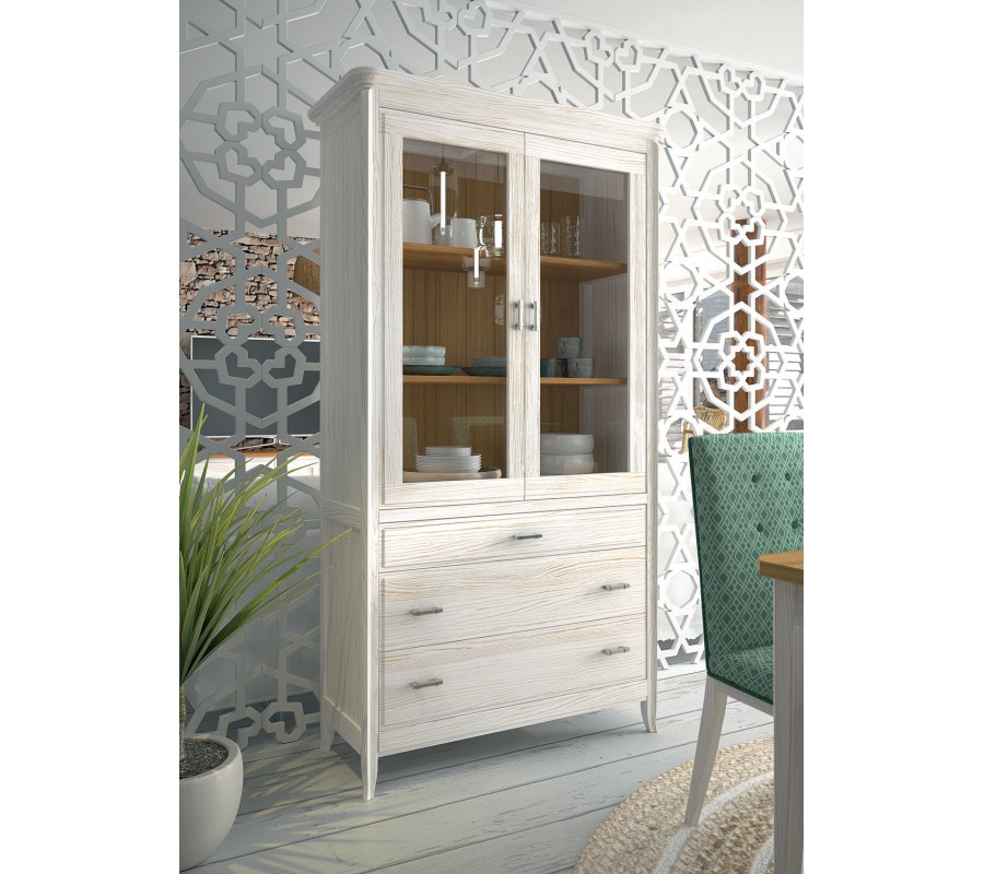 Luxusná vysoká dvojdverová presklená vitrína z masívu Genova v modernom prevedení s tromi zásuvkami a kovovými rukoväťami 202cm