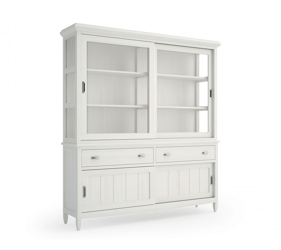 Moderná masívna vitrína Amberes so zásuvkami, sklenenými a posuvnými dvierkami 210cm