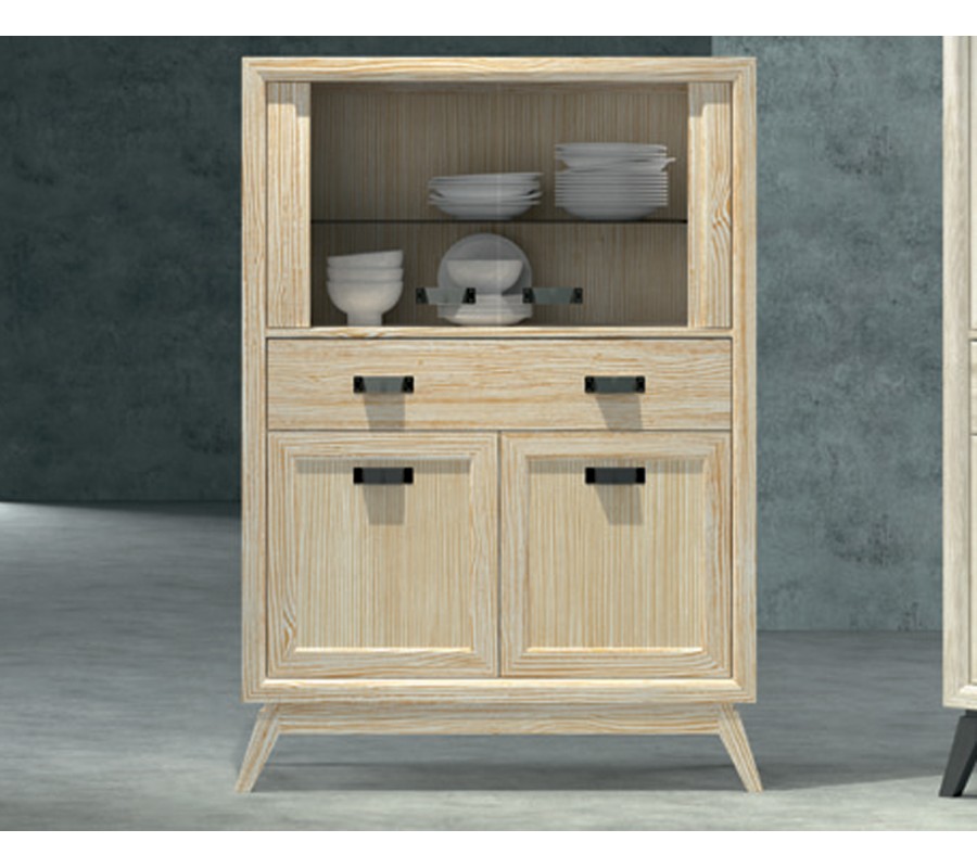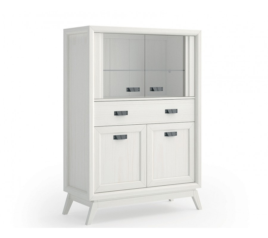 Vitrína má nižšiu lineárnu mohutnú siluetu, ktorú odľahčuje podstava v art deco štýle s dynamicky zošikmenými nožičkami a menším obdĺžnikovým rámom, na ktorom je položený úložný priestor. Ten pozostáva z dvoch dvojdverových skriniek, oddelených širokou zásuvkou. Spodné dvierka sú drevené a poskytujú diskrétne uzavretý priestor na textílie či dokumenty, zatiaľ čo vrchné dvierka majú priehľadnú sklenenú výplň a umožňujú vystavenie reprezentatívneho riadu či dekorácií. Úchytky sú vyrobené z kovu a majú minimalistický obdĺžnikový tvar. Hrany korpusu sú vyzdvihnuté, čo podčiarkuje geometrickosť tvarov.