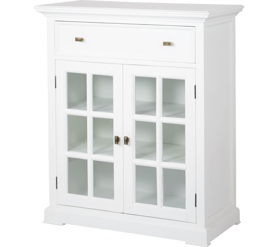 Rustikálna biela vitrína Belliene z masívneho dreva so sklenenými dvierkami a zásuvkou 115cm