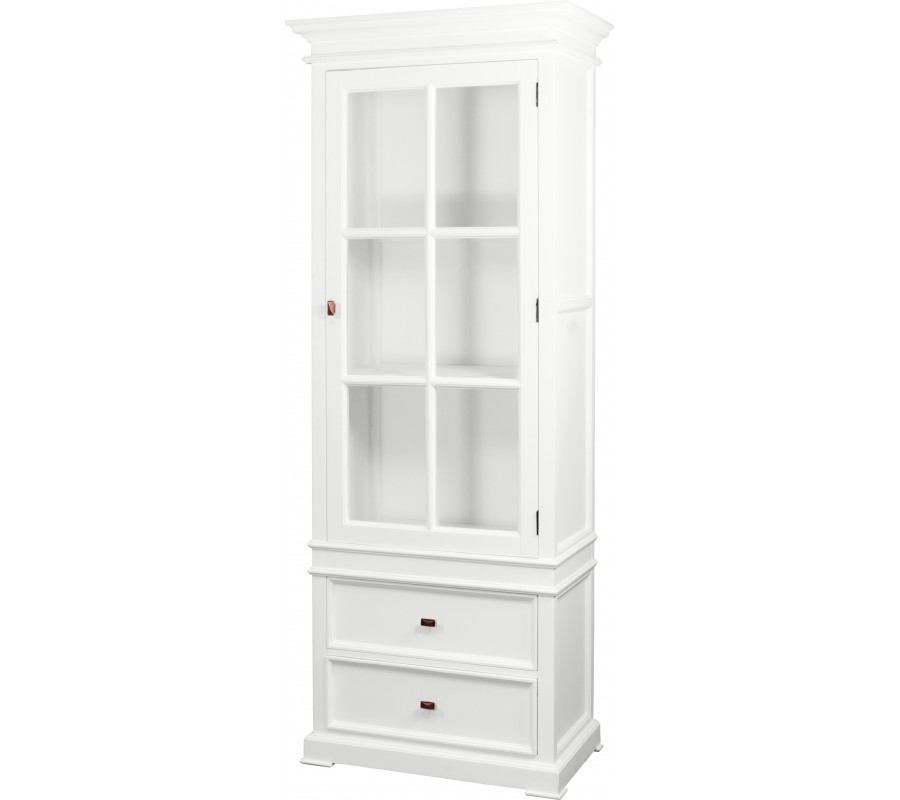 Nadčasová vysoká vitrína Belliene zaujme svojím štýlovým dizajnom kombinujúcim klasický vzhľad s prvkami moderného štýlu. Špecifickosť jej dizajnu spočíva v čistom lemovaní a jemnom ručne vyrezávanom ráme. Vitrína je vyrobená z kvalitného mahagónového masívu, ktorého elegantná biela povrchová úprava navnadzuje jemný provensálsky nádych. Okrem estetického vzhľadu je vitrína príťažlivá aj vďaka úložnému priestoru v podobe dvoch praktických zásuviek a troch poličiek so sklenenými dvierkami. Číre sklenené dvierka vytvárajú ilúziu ľahkosti a vyvažujú masívnu konštrukciu vitríny. Jemné elegantné úchyty z kovu príjemne dopĺňajú celkový dizajn. Vitrína Belliene vhodne doplní rustikálne, provensálsky a klasicky ladené obývačky alebo jedálne. Odporúčame ju kombinovať s podobne ladeným masívnym nábytkom a dekoráciami v svetlých pastelových farbách.