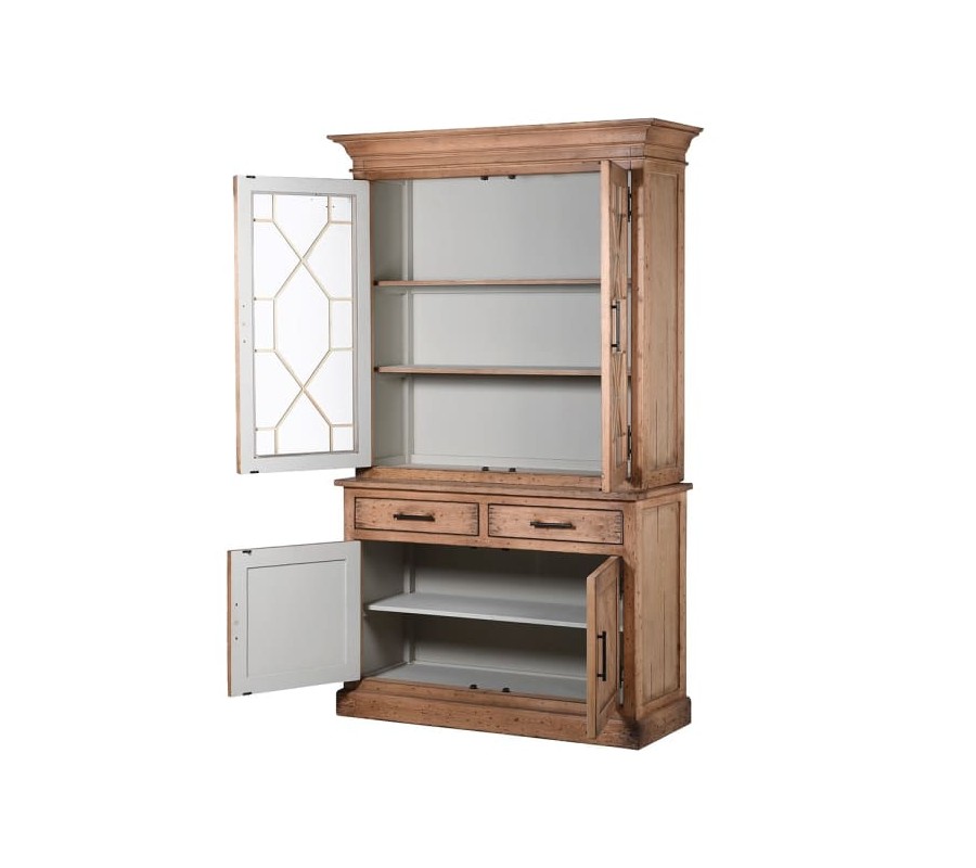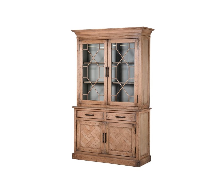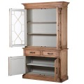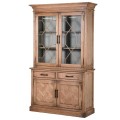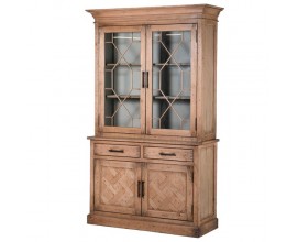 Masívna vidiecka vitrína Emilio v svetlohnedom prevedení so sklenenými dvierkami, poličkami a zásuvkami 220cm