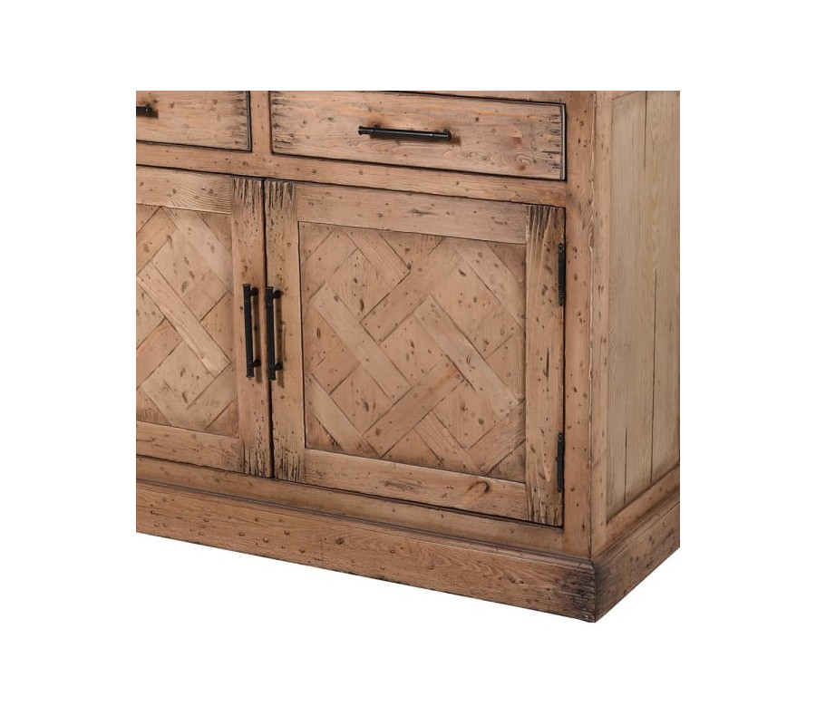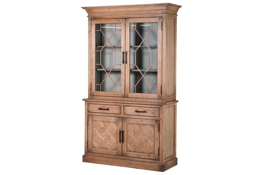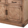 Štýlová vitrína Emilio je vyrobená z kvalitného masívneho dreva. Nesie sa v svetlohnedej farbe a vo svojom dizajne prepája elegancie s nádychom vidieckeho štýlu. Vitrína zaujme predovšetkým vďaka preskleným dvierkam vo vrchnej časti, ktoré sú zdobené jednoduchým geometrickým vzorom z dreva. Za dvierkami sú umiestnené tri praktické poličky vhodné na vystavenie jedálenských potrieb, porcelánových setov, dekorácií či kníh. V spodnej časti sa nachádzajú dve poličky s plnými drevenými dvierkami a dve praktické zásuvky. Drevená konštrukcia je na dvierkach ovzláštnená zaujímavým dizajnom vytvárajúcim efekt parketových dosiek. Získava tak unikátny vidiecky vzhľad, ktorý príjemne doplní priestory vašej obývačky, jedálne či kuchyne. Pre dokonalý súlad odporúčame vitrínu Emilio kombinovať aj s ďalšími masívnymi kúskami a doplnkami z prírodných materiálov.