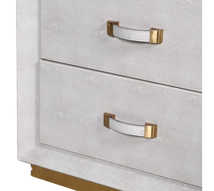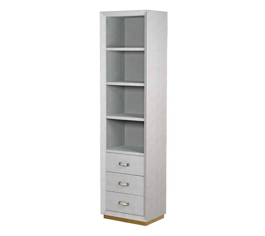 Moderná kožená vitrína Ivoria s otvorenými poličkami a tromi zásuvkami v perlovej sivej farbe so šagrénovou textúrou 190cm