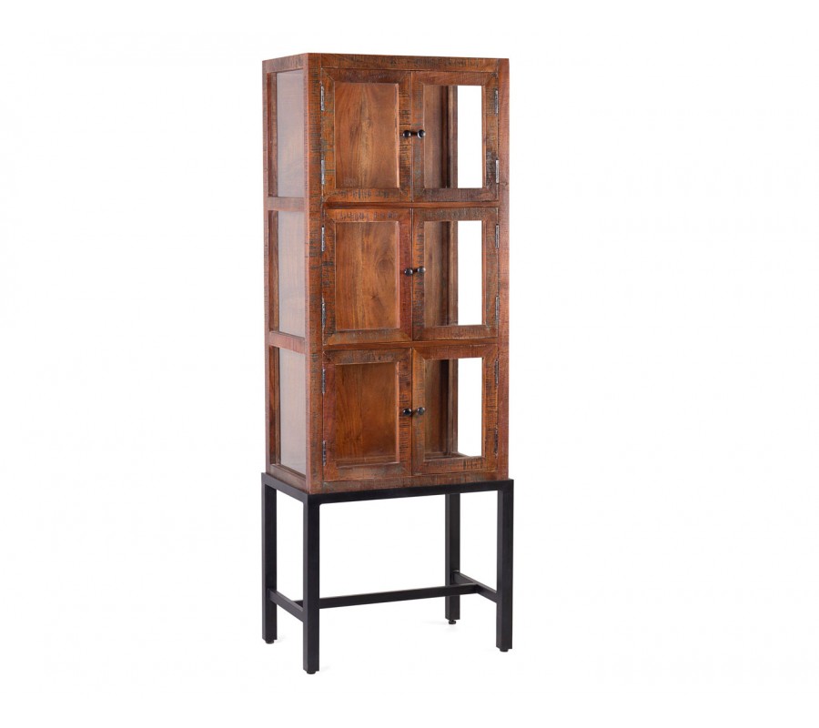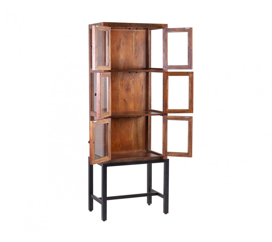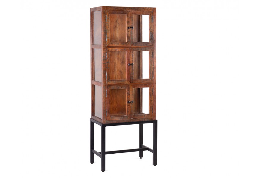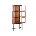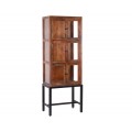 Vintage masívna vitrína Revia z akáciového dreva prírodnej hnedej farby s čiernou kovovou podstavou 173cm