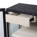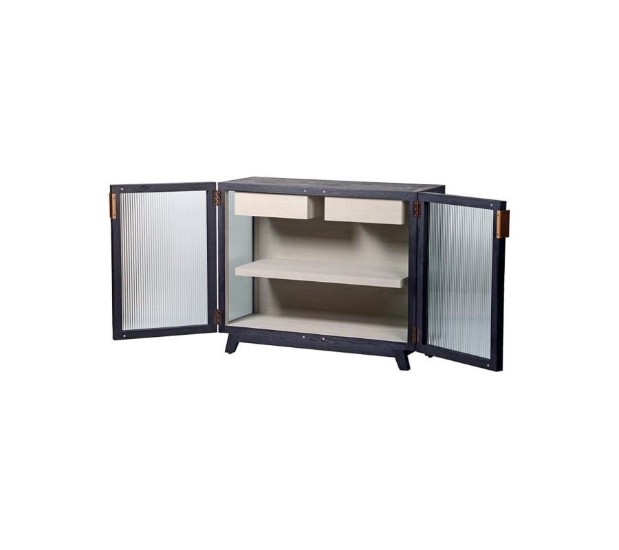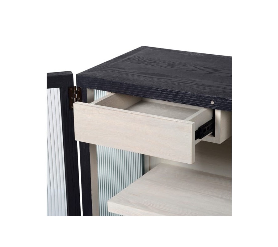 Dizajnová skrinka Kaleon je unikátnym kúskom, ktorý si svoje miesto nájde predovšetkým v mdoerne ladených obývačkách či jedálňach. Pozostáva z masívnej čiernej konštrukcie, ktorú vo vnútri dopĺňa úložný priestor v podobe zásuvky a poličiek svetlohnedej farby. Nadčasový vzhľad skrinky dopĺňa dvojica dvierok z ryhovaného skla, ktorá nielen chráni vaše predmety pred prachom či iným poškodením, ale aj elegantne dopĺňa celkový dizajn. Sklenená výplň sa nachádza aj na bočných stenách skrinky. Jednoduché zošikmené nožičky sú praktické najmä pri upratovaní a manipulácii. Nadčasový vzhľad skrinky Kaleon si zamilujete aj vďaka jeho jednoduchosti a funkčnosti. Skrinka Kaleon vytvorí skvelú kombináciu s masívnym jedálenským stolom a stoličkami, moderným príborníkom a doplkami z kovu či skla.
