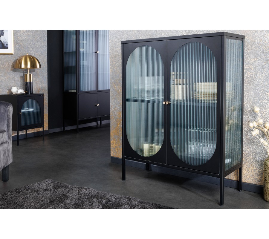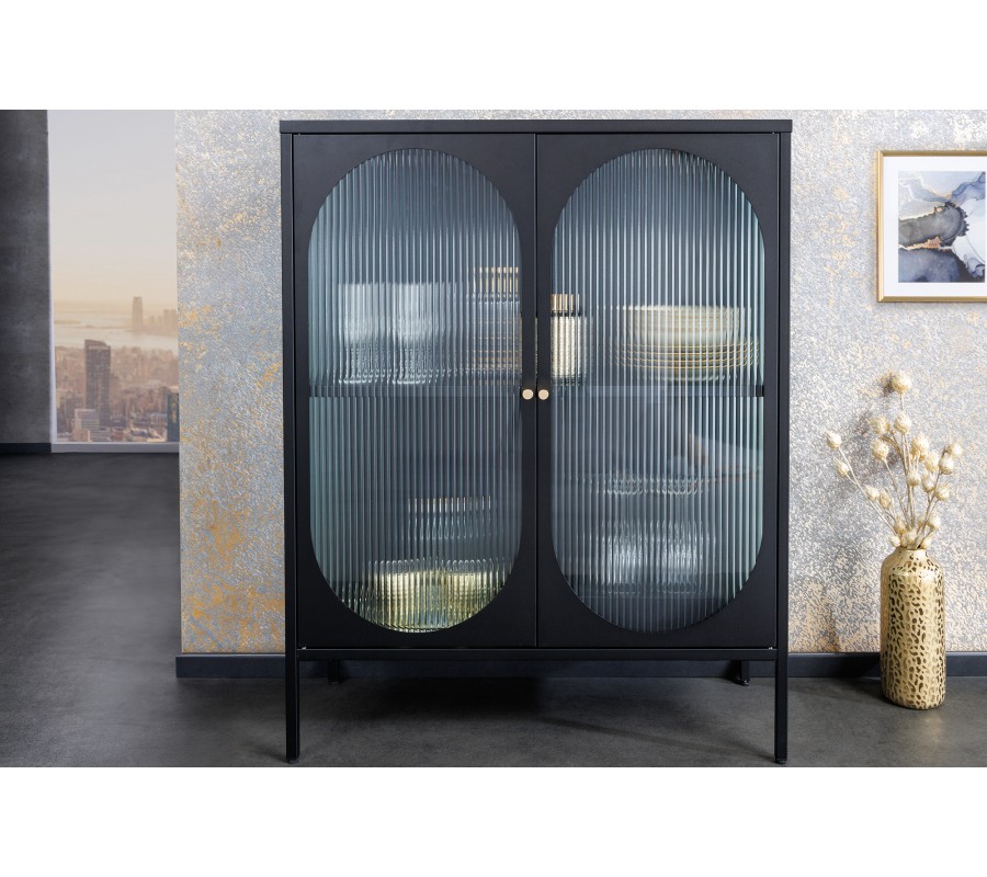 Moderná čierna industriálna barová skrinka Industria Durante s dvojitými dvierkami s rebrovaným sklom 110 cm