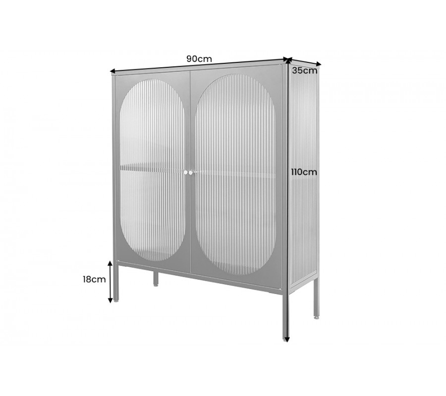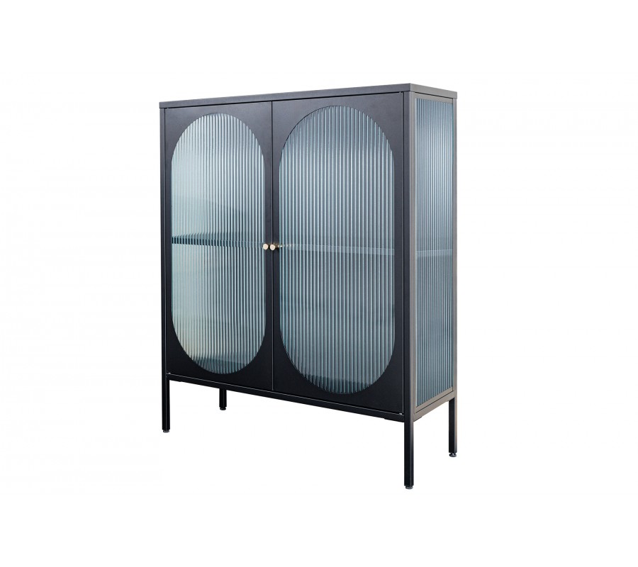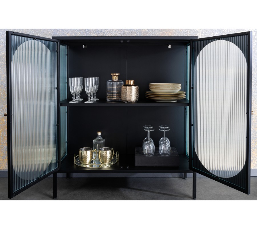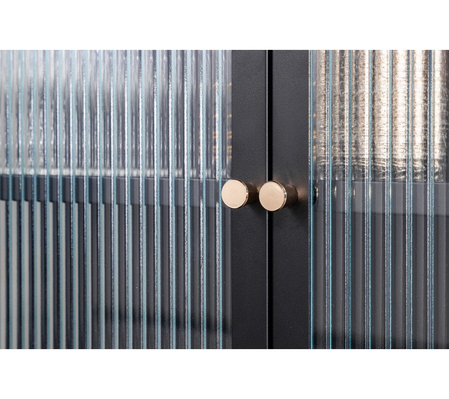 Štýlový polopriehľadný materiál pôsobí moderným dojmom a odhaľuje siluety predmetov uložených v skrinke. Pri uskladnení fliaš či rôzneho farebného riadu dodáva miestnosti zaujímavý vizuálny prvok. Zadná stena a police majú čiernu farbu. Dvojité dvierka sa otvárajú pomocou okrúhlych úchytiek. Ich lesklá zlatá farba vytvára subtílny luxusný akcent.