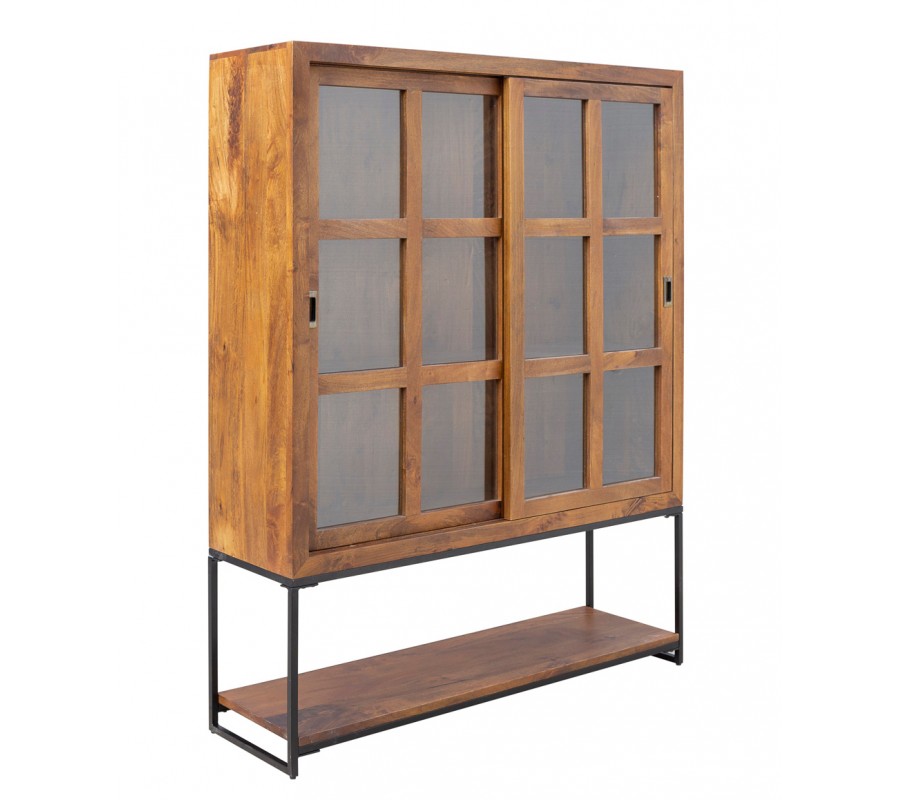 Luxusná masívna industriálna vitrína Elonie s posuvnými dvierkami z mangového dreva v hnedej farbe 180 cm