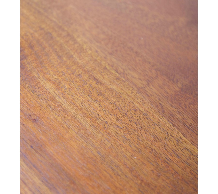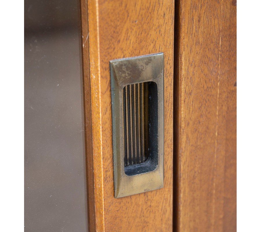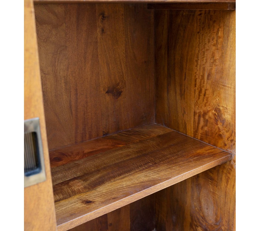 Vitrína je vyrobená z masívneho mangového dreva. Má krásnu teplú hnedú farbu s odtieňmi žltej a červenej. Na hladkých plochách je tiež viditeľná prírodná kresba letokruhov. Kovová podstava má čiernu farbu a prináša do dizajnu nádych industriálneho štýlu. Úložný priestor za sklenými dvierkami je predelený dvomi policami. Dvierka sa otvárajú pomocou kovovej úchytky s jednoduchým obdĺžnikovým tvarom v mosadznom prevedení.