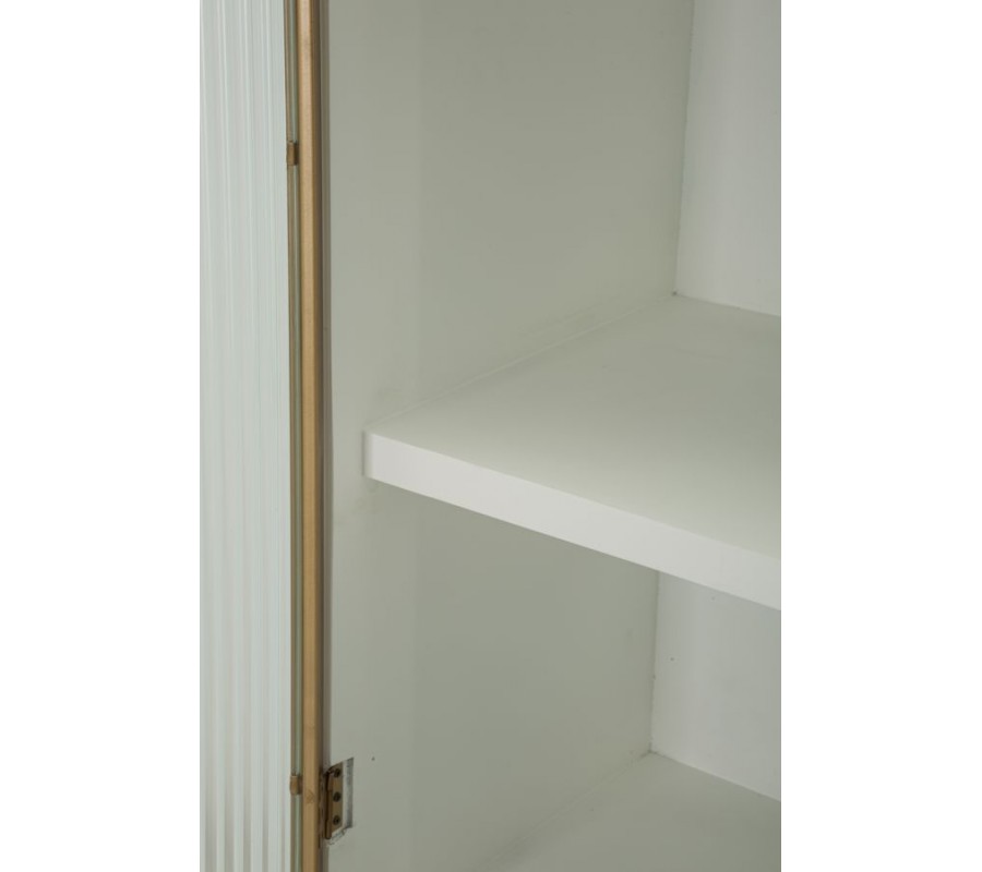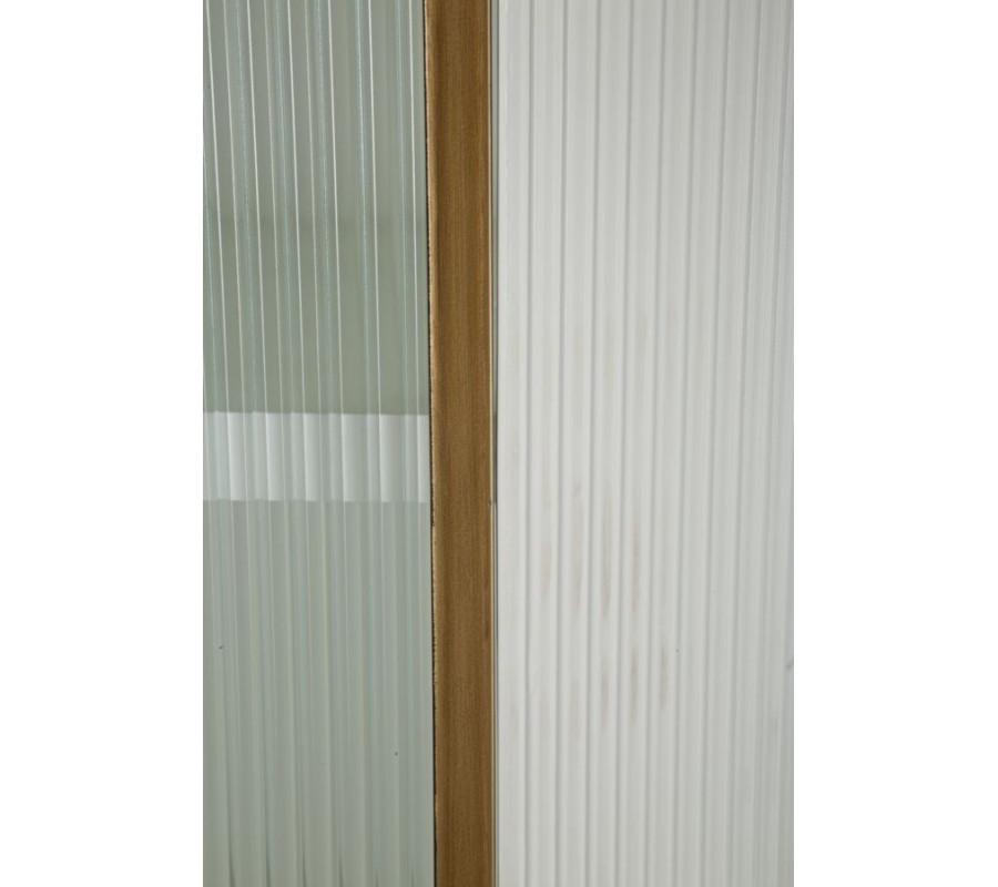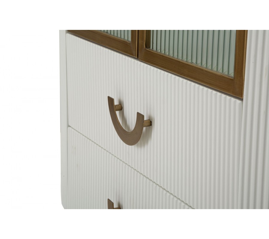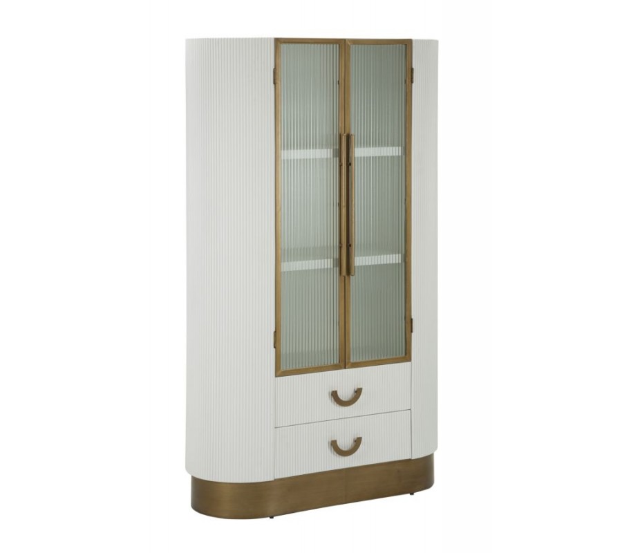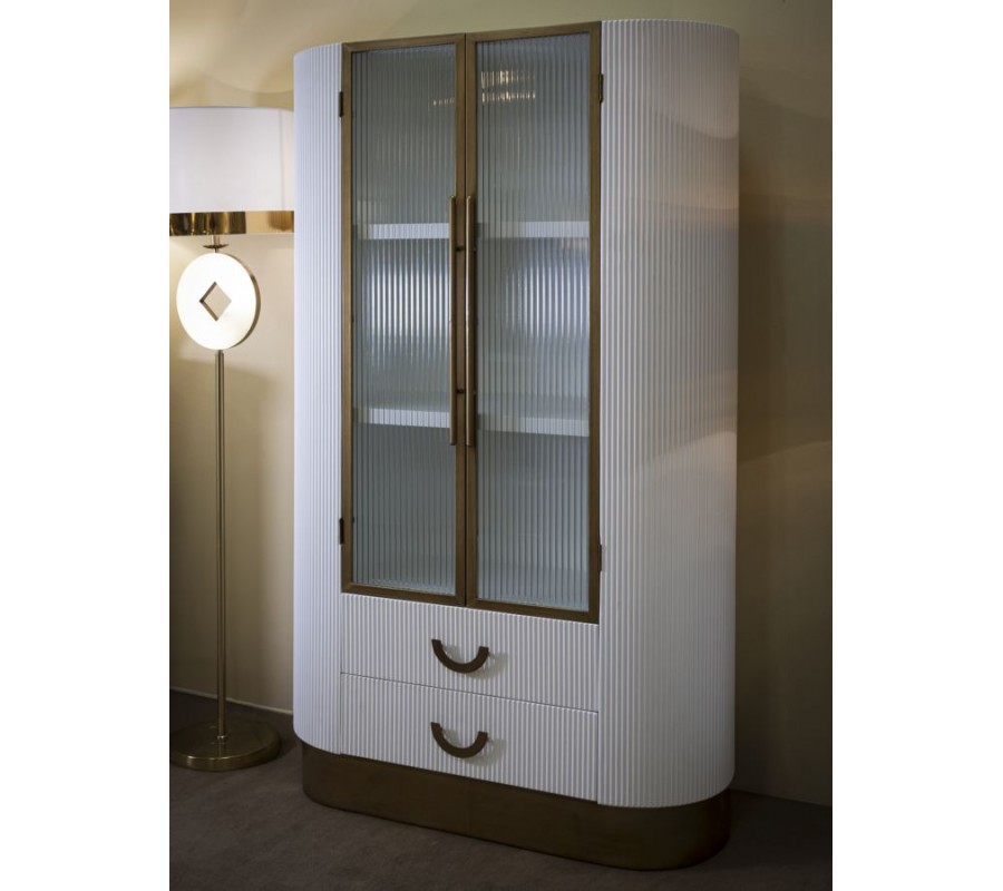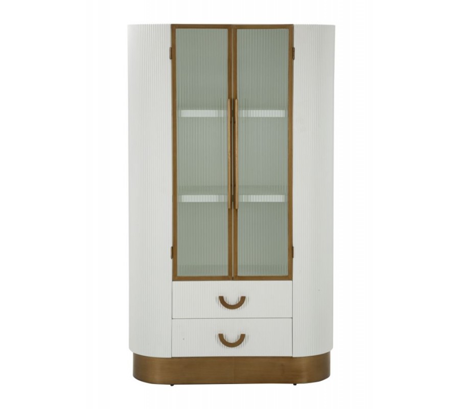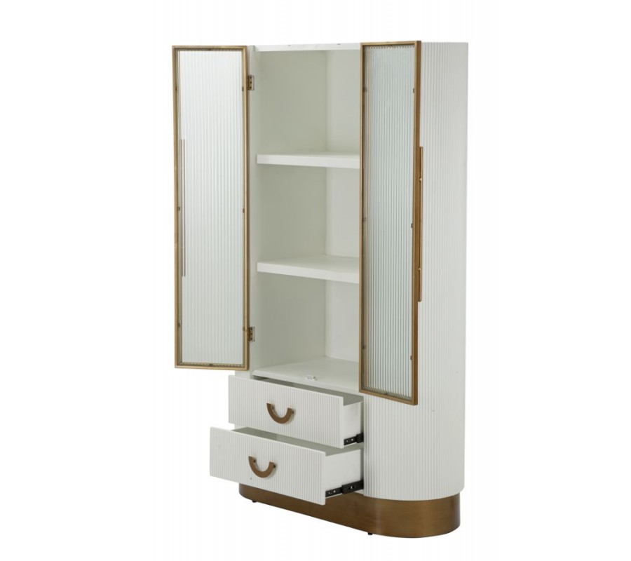 Vitrína Glamia Blanca upúta už na prvý pohľad svojím jemne zaobleným tvarom a vrúbkovaným krémovým povrchom. V stredovej časti sa nachádzajú dvojkrídlové dvierka so zlatým kovovým rámom, vyplnené priehľadným laminátom s jemným zvislým ryhovaním. Vďaka tomu je možné nielen nahliadnuť dovnútra, ale tiež vytvoriť príjemný optický efekt. Za dvierkami sa ukrývajú dve police, korpus je z jaseňového dreva, čo vitríne dodáva útulný a kvalitný dojem.