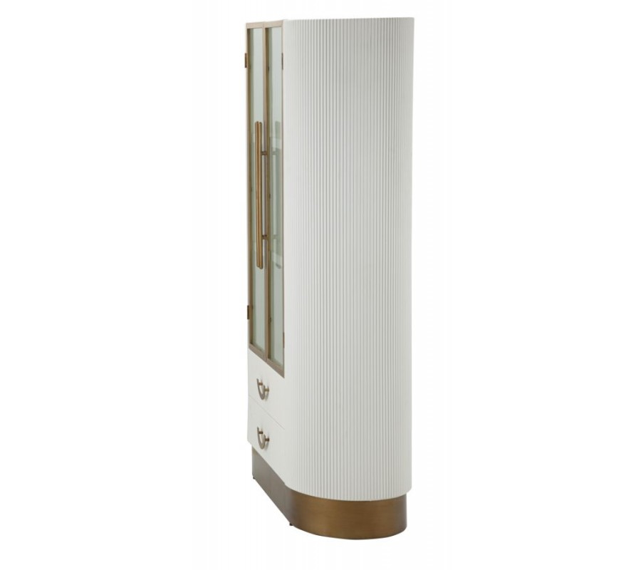 Vitrína je vyrobená z laminátu s bielou povrchovou úpravou, doplnenou o kovové detaily v zlato bronzovom prevedení, typickom pre art deco a glamour štýl. Ideálna je do obývačky, jedálne či reprezentatívnej kancelárie, kde vynikne jej noblesný charakter. Jednoducho ju skombinujete s ďalšími kúskami so zlatými akcentmi, so zamatovým čalúnením či s doplnkami v sýtych farbách smaragdová, bordová alebo s neutrálnymi odtieňmi béžovej či krémovej, ktoré podčiarknu jej sofistikovaný dizajn.
