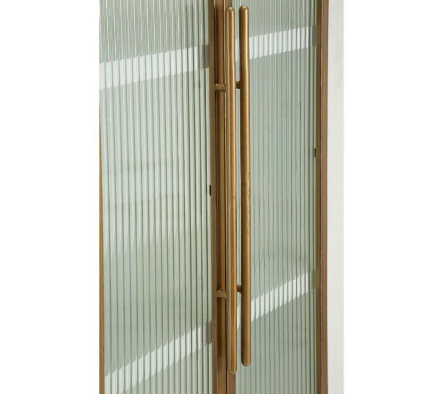 V spodnej časti nájdete dve zásuvky, ktoré disponujú polkruhovými úchytkami v zlatom až bronzovom odtieni, ten istý farebný tón sa opakuje aj na spodnom kovovom podstavci, ktorý obopína oblé rohy nábytku. Vysoké úchytky na dvierkach sa tiahnu takmer po celej výške sklenenej výplne, čo zdôrazňuje vertikálne línie a zároveň pôsobí luxusne a elegantne.
