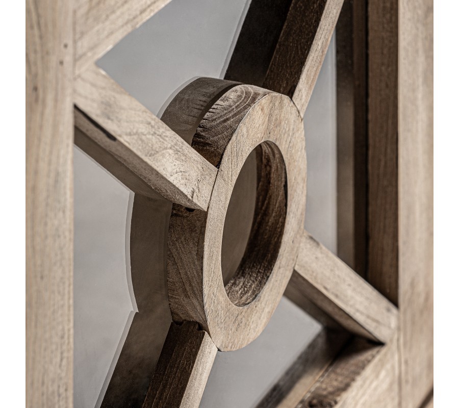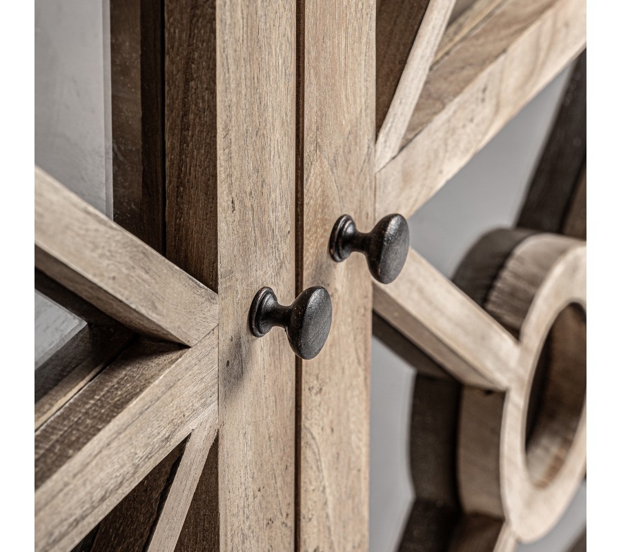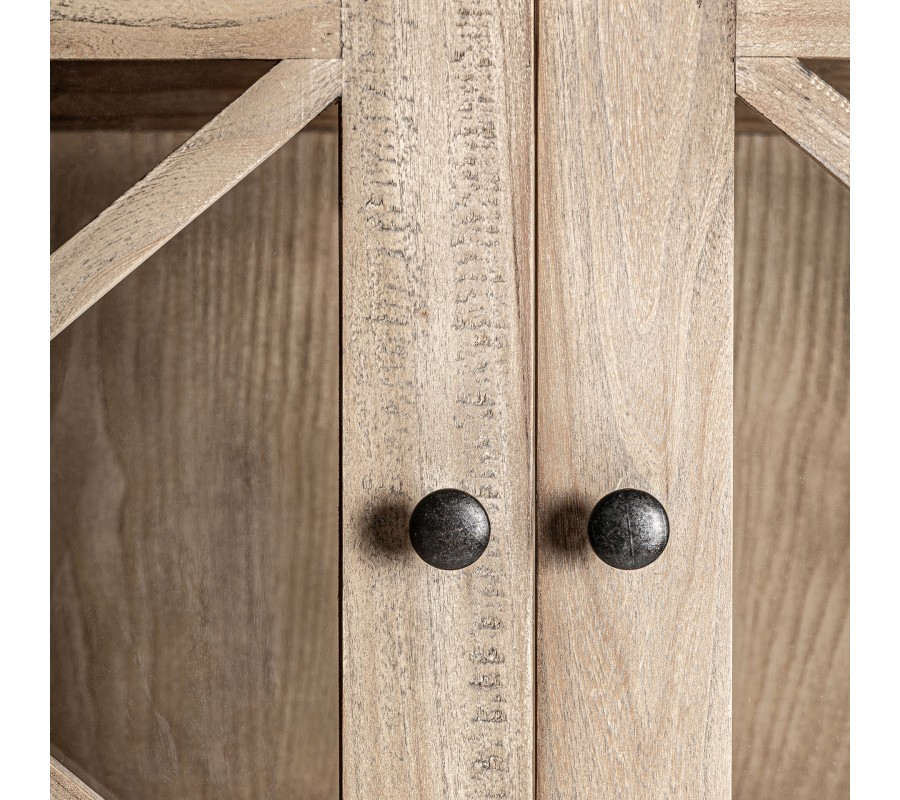 Dvierka sú osadené kovovými guľatými úchytkami v tmavej patinovanej úprave, ktoré kontrastujú s prírodným tónom dreva a zároveň zachovávajú rustikálny štýl. Ich jednoduchý tvar elegantne dopĺňa celkový vzhľad a umožňuje pohodlné otváranie.