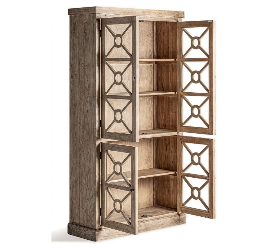 Knižnica Herand predstavuje majestátny kus nábytku s autentickým rustikálnym charakterom. Je vyrobená z masívneho brestového dreva s výraznou, nepravidelnou kresbou letokruhov, ktoré umocňujú prirodzený a jedinečný vzhľad každého kusa. Povrch je nelakovaný, jemne zdrsnený, čo zvýrazňuje hĺbku materiálu a remeselný dojem.