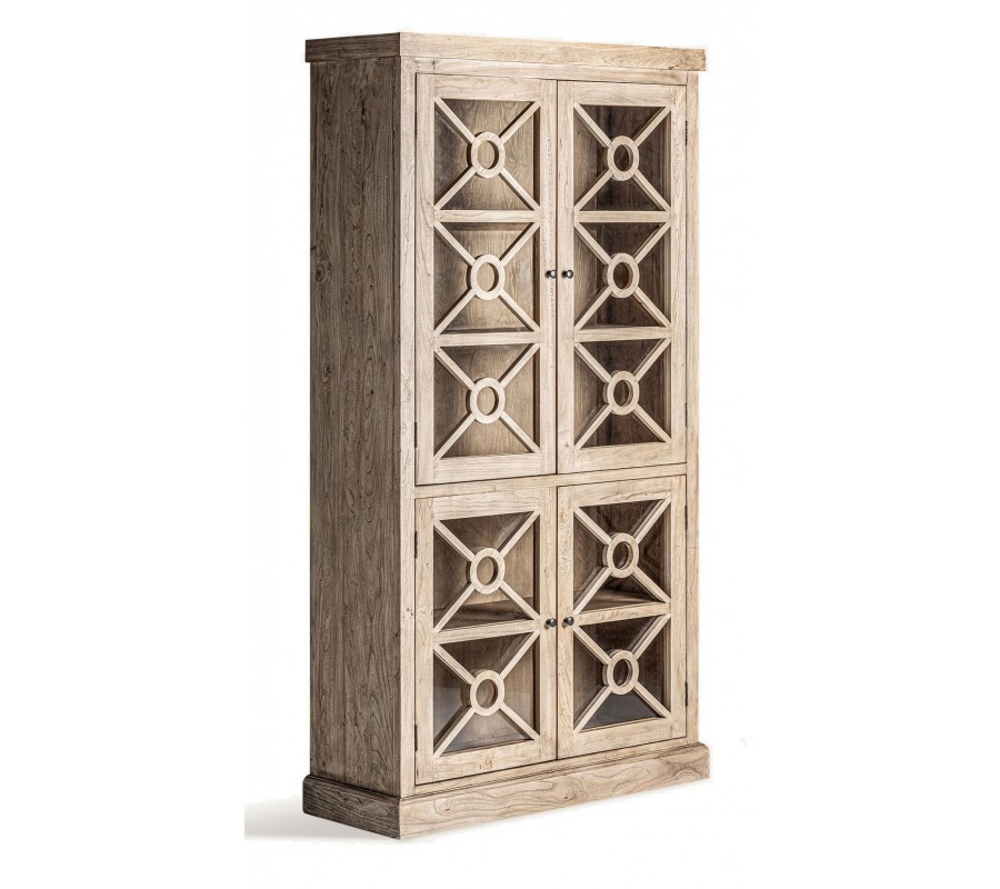 Luxusná koloniálna obdĺžniková masívna hnedá štvordverová vitrína Herand so sklenenou výplňou so štyrmi policami 205 cm