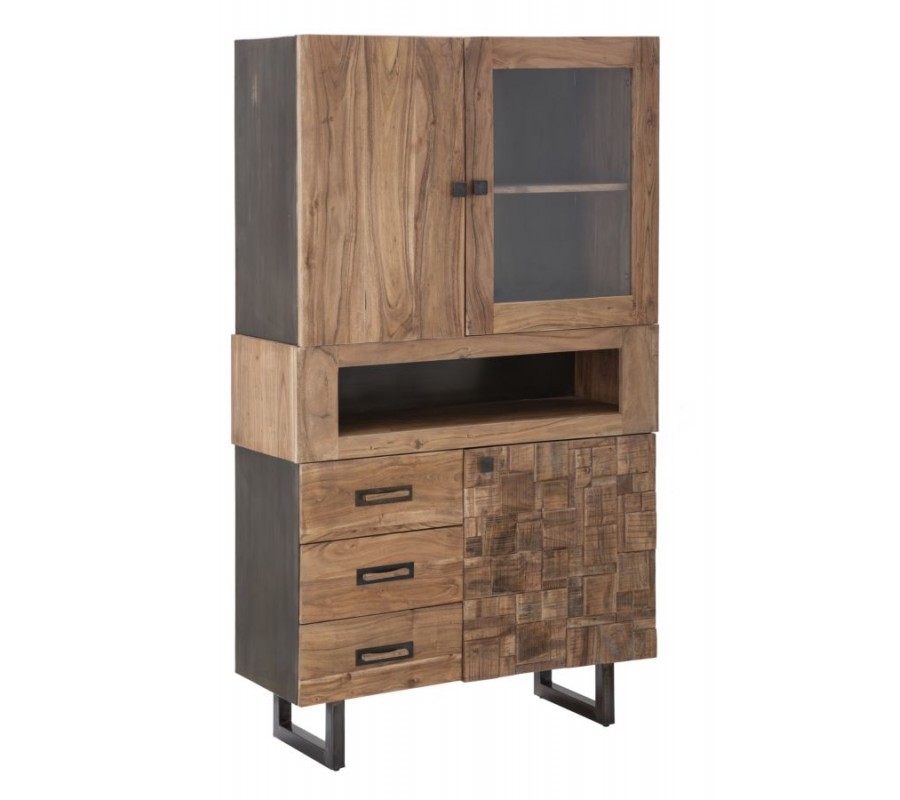 Industriálna obdĺžniková hnedá trojdverová vitrína Cubilio z masívneho akáciového dreva s kovovými nožičkami 177 cm