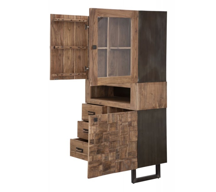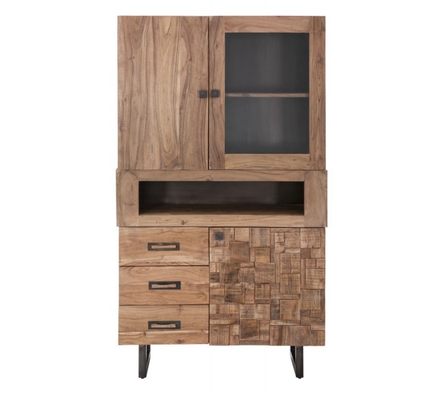 Úložný priestor je prehľadne organizovaný – vitrína má tri zásuvky v pravej časti, ktoré sú ideálne na menšie predmety ako príbory, prestierania alebo dokumenty. V ľavej časti sa nachádzajú dvoje plné dvierka, za ktorými je ukrytý priestranný úložný priestor s jednou policou, vhodnou napríklad na riad alebo textílie. Tretie dvierka v strednej časti sú presklené, čo umožňuje elegantné vystavenie dekorácií, skla alebo kníh, pričom vnútro podčiarkuje prírodný tón dreva. Všetky dvierka a zásuvky sú vybavené čiernymi okrúhlymi kovovými úchytkami, ktoré pôsobia decentne, ale zároveň ladia s industriálnym duchom nábytku.
