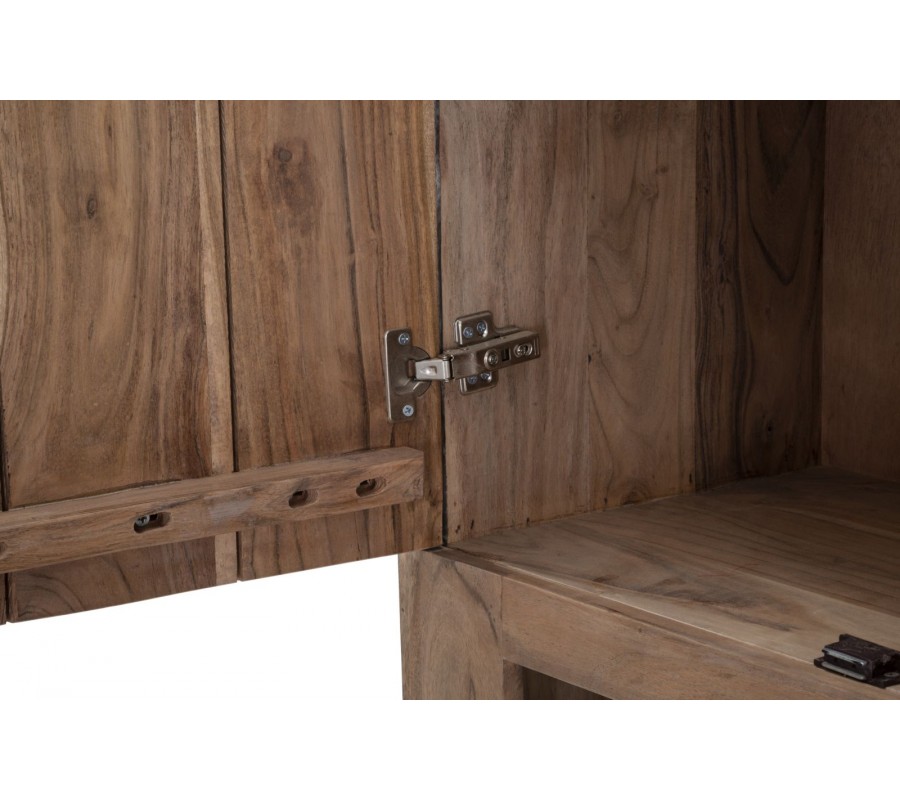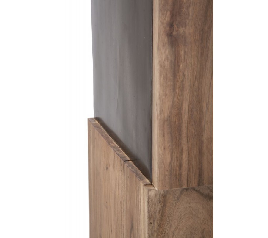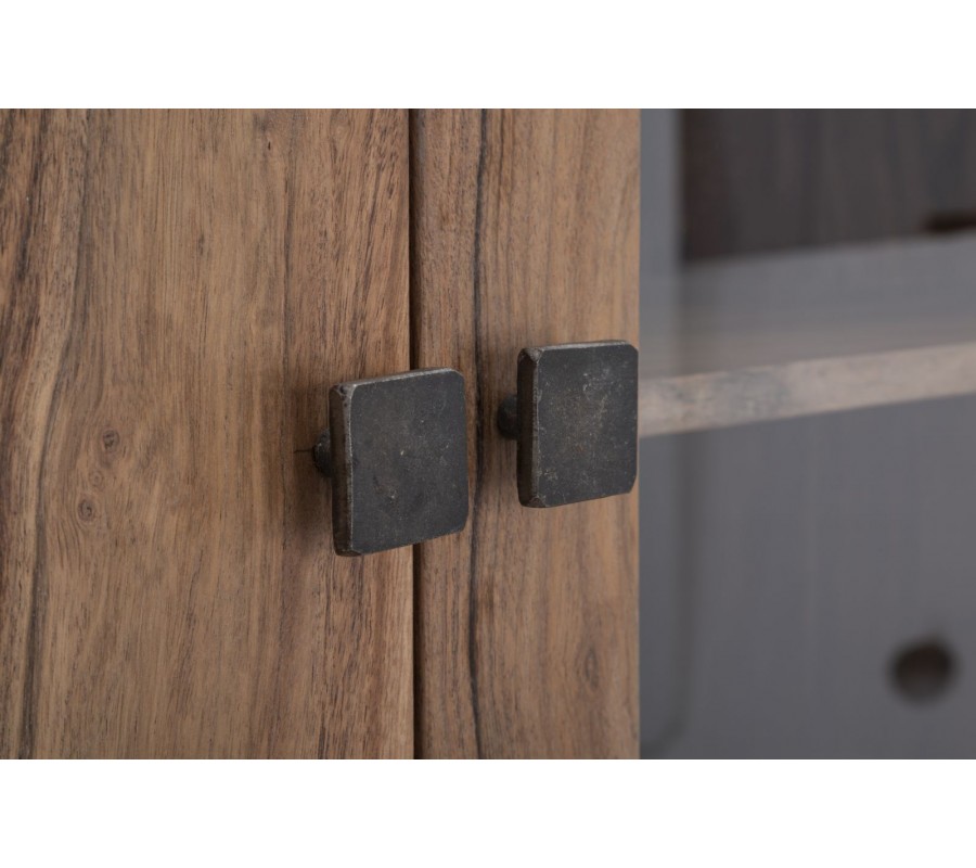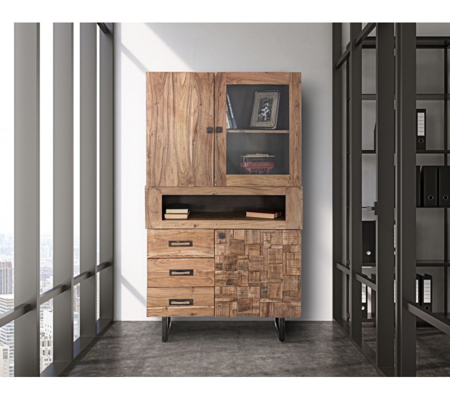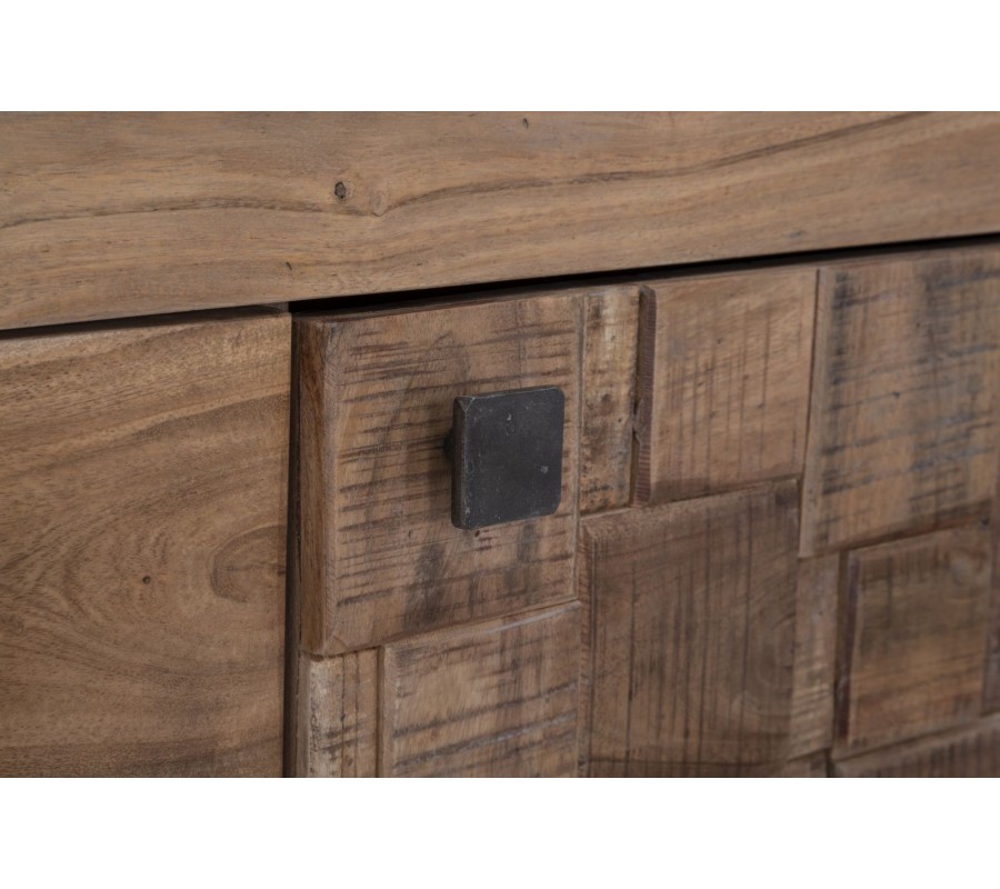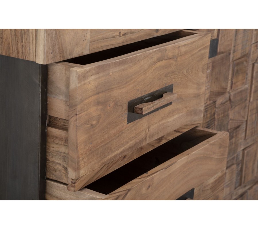 Vitrína Cubilio je výrazný interiérový solitér, ktorý spája poctivé remeselné spracovanie s industriálnym štýlom. Vyrobená z masívneho akáciového dreva, zaujme už na prvý pohľad geometrickým mozaikovým dekorom na čelách zásuviek a dvierok – kombinácia trojuholníkových a diagonálnych línií vytvára plastický efekt s premenlivou hĺbkou, ktorý mení svoj výraz v závislosti od dopadu svetla. Tmavé lakovanie na bočných a horných plochách kontrastuje s prírodným hnedým odtieňom prednej strany a podčiarkuje noblesu celkového dizajnu.