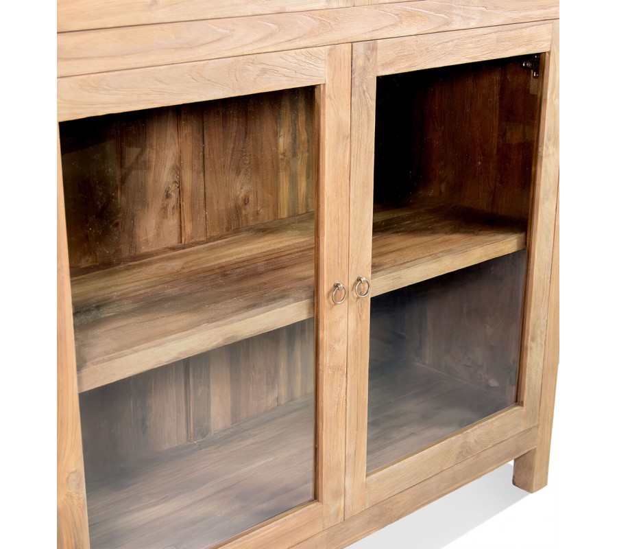 Krátke hranaté nožičky plynule prechádzajú do rámu nábytku, ktorý v kombinácii s jednoduchou rímsou vo vrchnej časti vkusne oživuje lineárny dizajn. Vitrína je vyrobená z masívneho teakového dreva v svetlej hnedej matnej farbe. Toto prevedenie pôsobí naturálnym dojmom a exotické drevo dodáva nábytku dotyk koloniálneho štýlu.