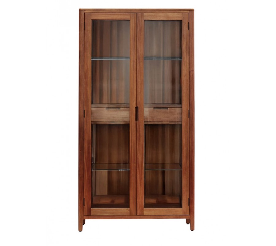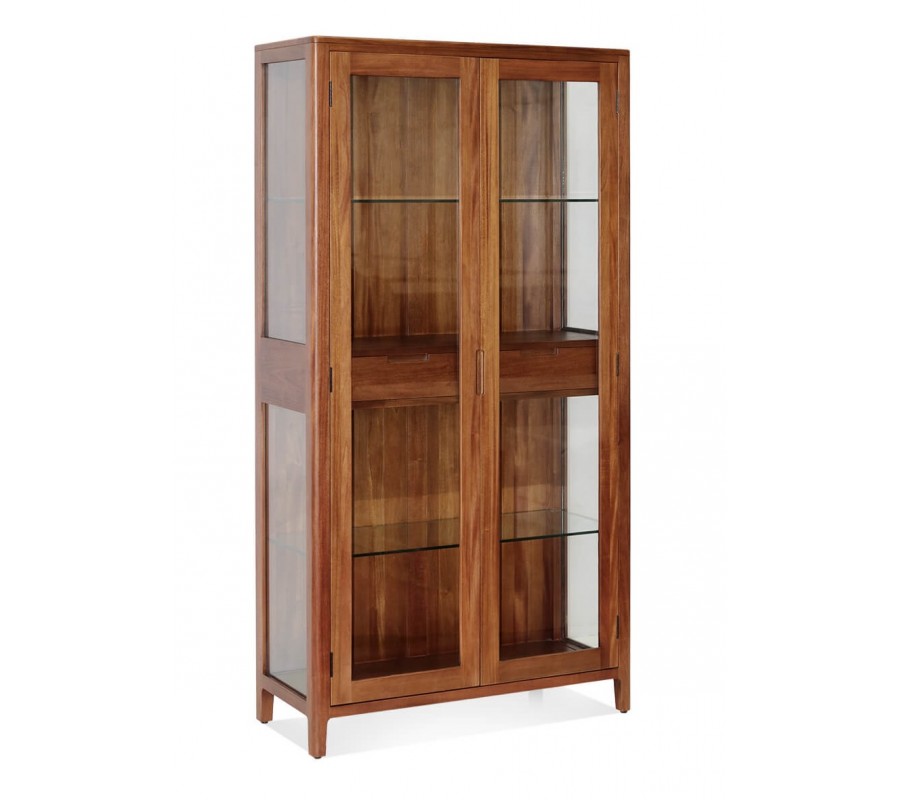 Vitrína má vkusnú minimalistickú siluetu s obdĺžnikovým pôdorysom. Je postavená na štyroch krátkych nožičkách, ktorých línia plynule prechádza po celej výške nábytku. Vonkajšie hrany sú elegantne zaoblené. Zadná stena je drevená, zatiaľ čo bočné strany a dvojité dvierka vypĺňa priehľadné sklo, osadené v drevenom ráme.