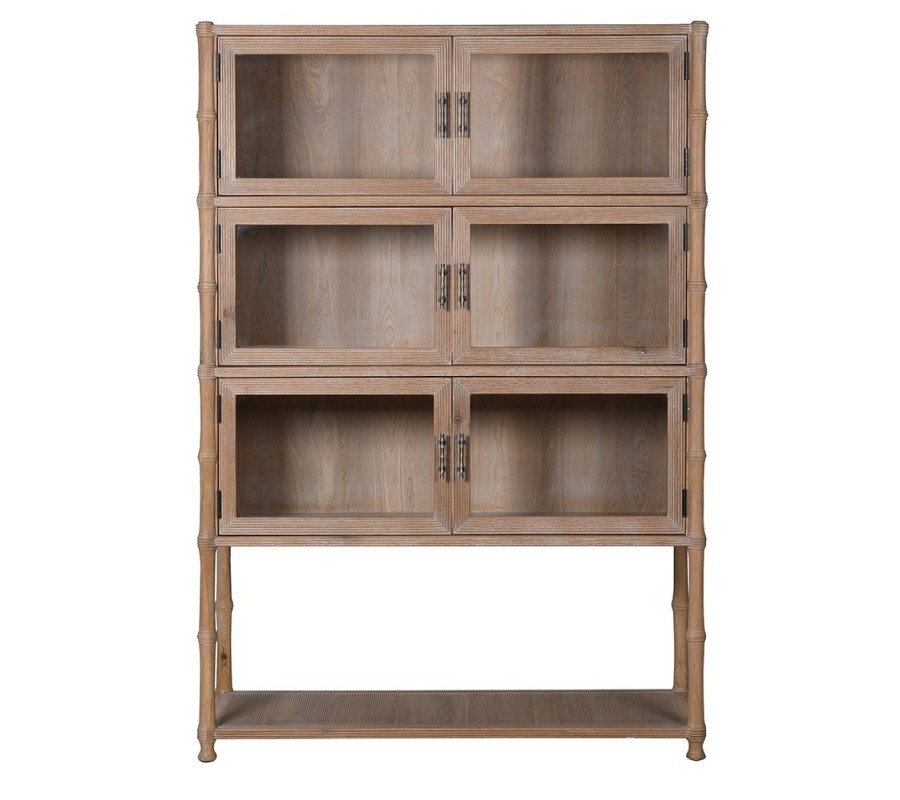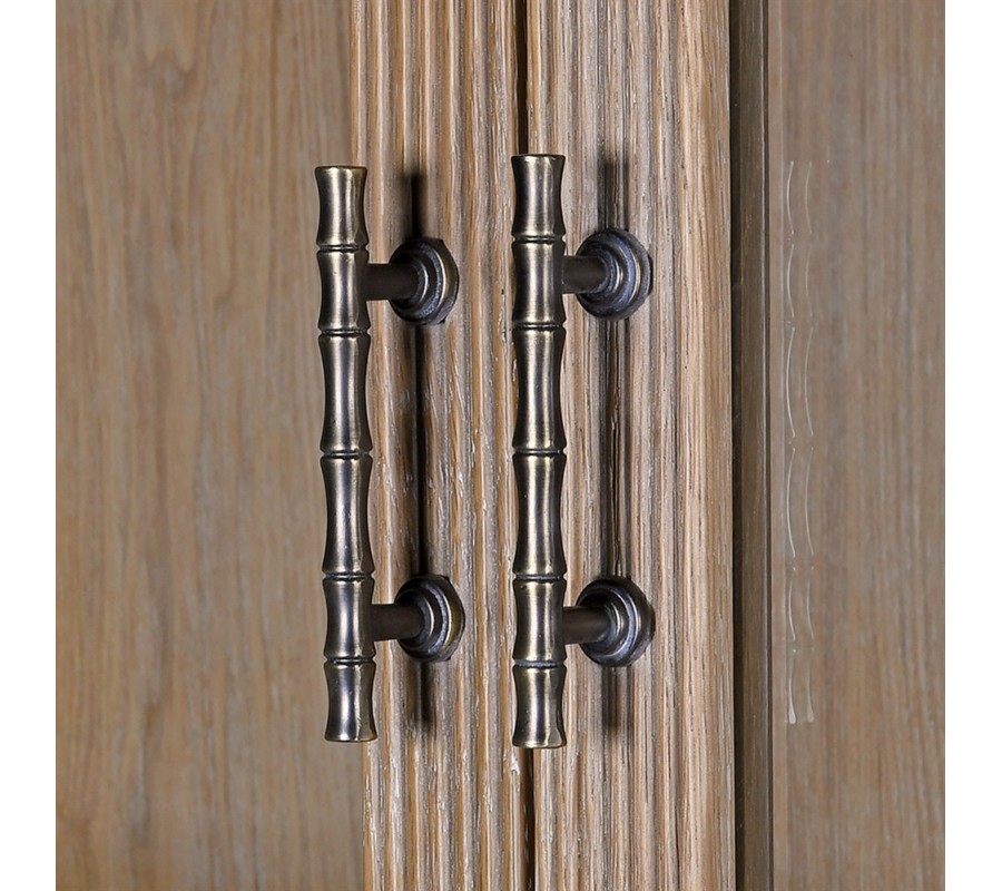Dvierka majú predĺžené úchytky z kovu v mosadznej farbe, ktorých dekoratívny tvar je inšpirovaný bambusovými tyčami. Rovnaký dekoratívny prvok sa opakuje aj na okrajoch konštrukcie, kde je tento nápaditý tvar použitý ako rámovanie v podobe vertikálnych tyčí, tie na spodnej časti plynulo prechádzajú do štyroch nožičiek. Tento detail jej dodáva koloniálny charakter a pôsobí elegantne a exoticky.