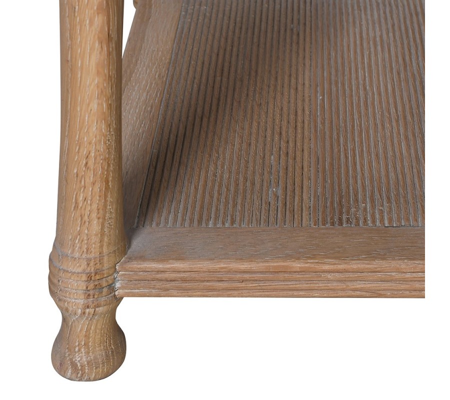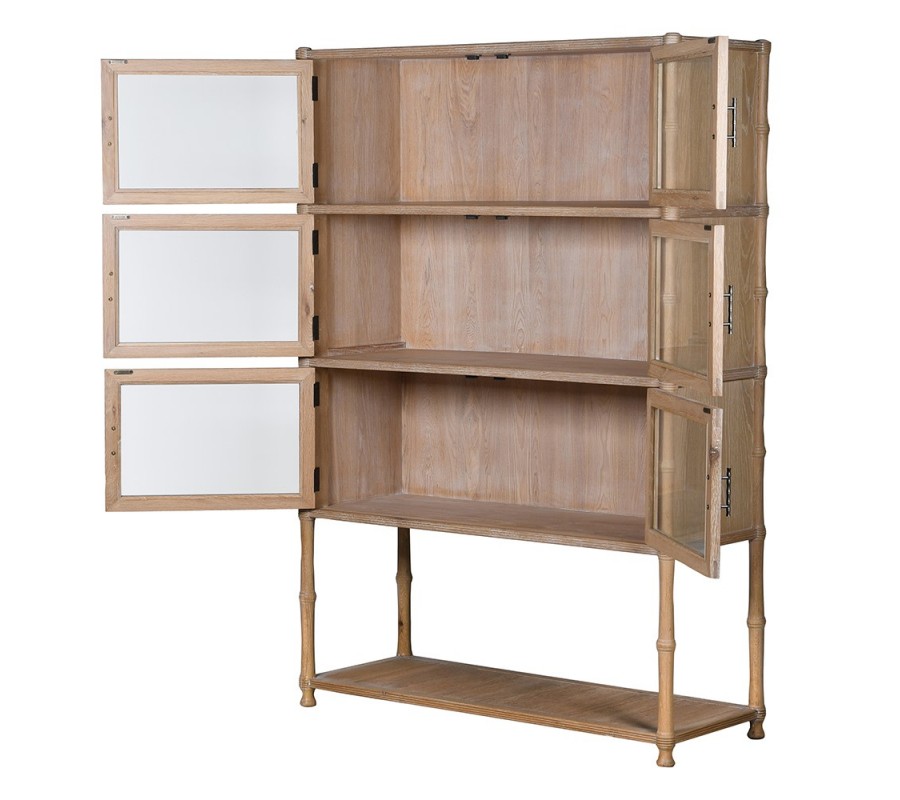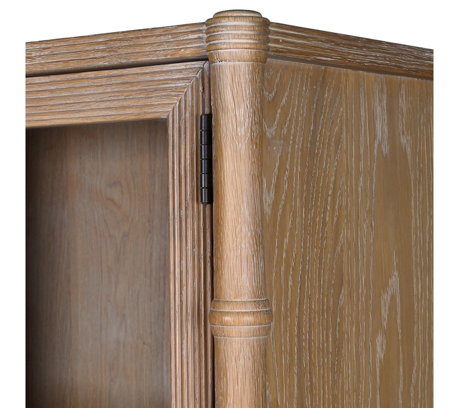 Obdĺžniková luxusná vitrína Kamila je vyrobená z dubového dreva v svetlohnedej farbe s jemným patinovaným efektom, ktorý zvýrazňuje prirodzenú kresbu dreva a dodáva jej autentický vidiecky vzhľad.
