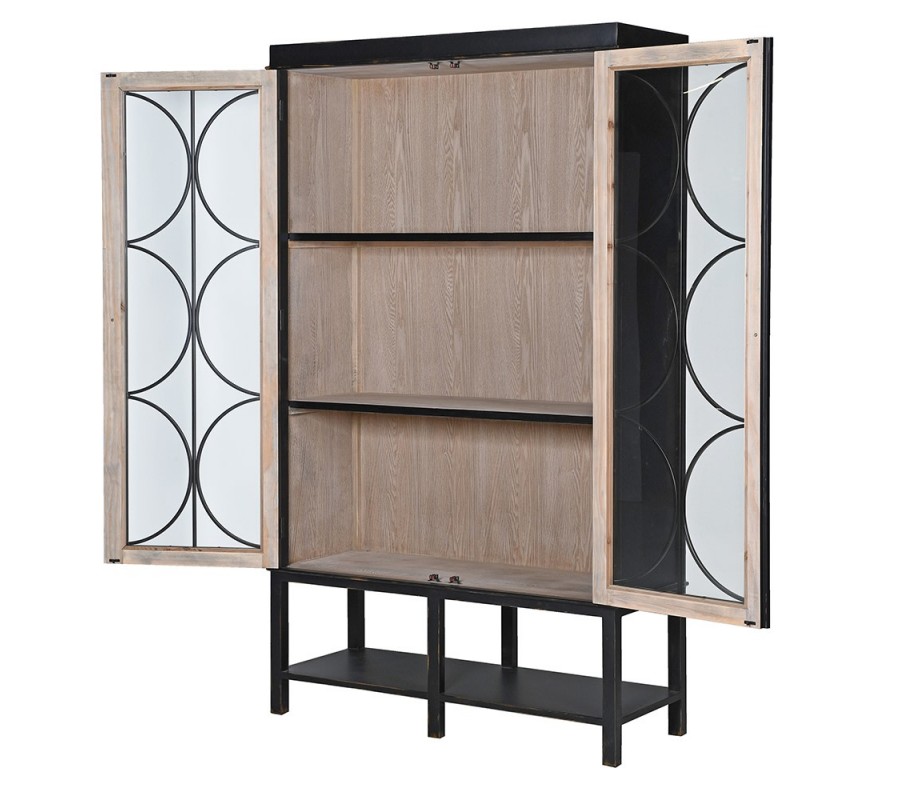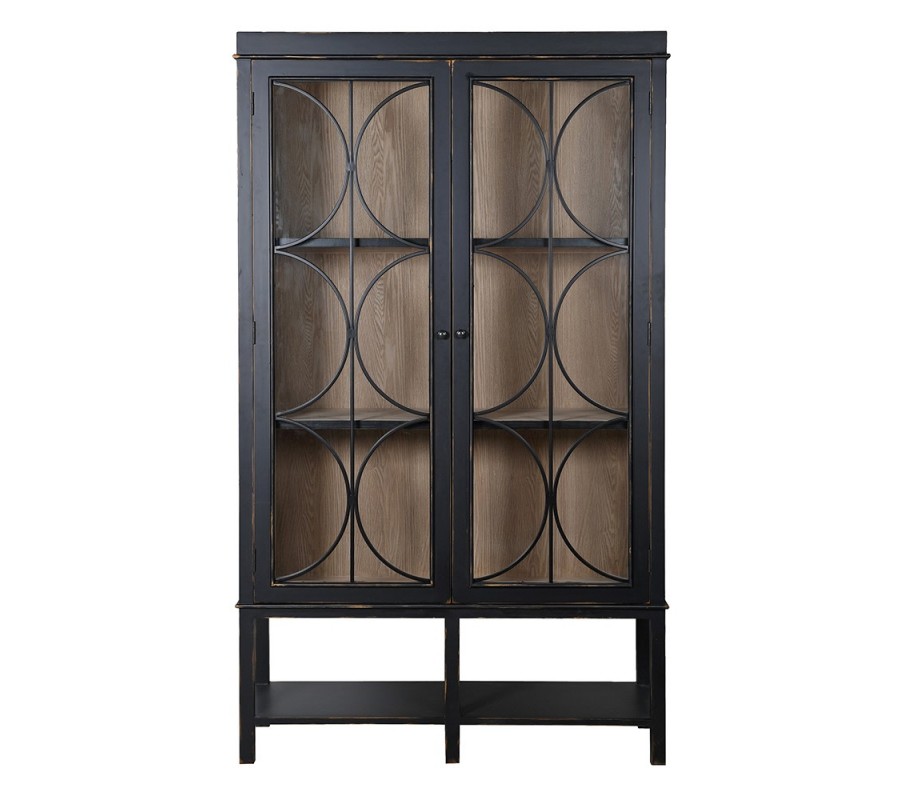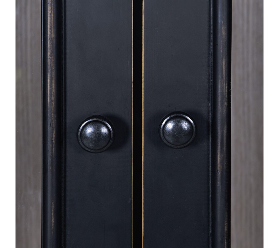Dvojité dvierka sú presklené a ich výplň zdobia ohýbané kovové prvky, vytvárajúce geometrickú kompozíciu kruhov a rovných línií. Úchytky sú malé, okrúhle a pôsobia minimalistickým dojmom. Vonkajšie časti sú lakované v čiernej farbe a miestami je náter zámerne zošúchaný, čo dodáva nábytku vintage nádych. Kovové časti sú tiež čierne.