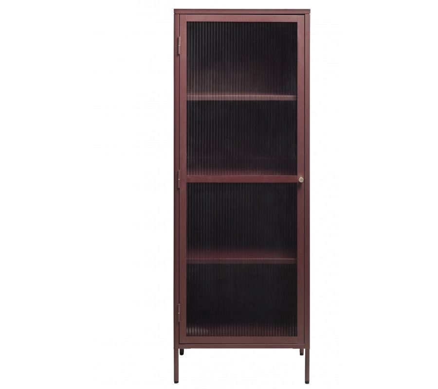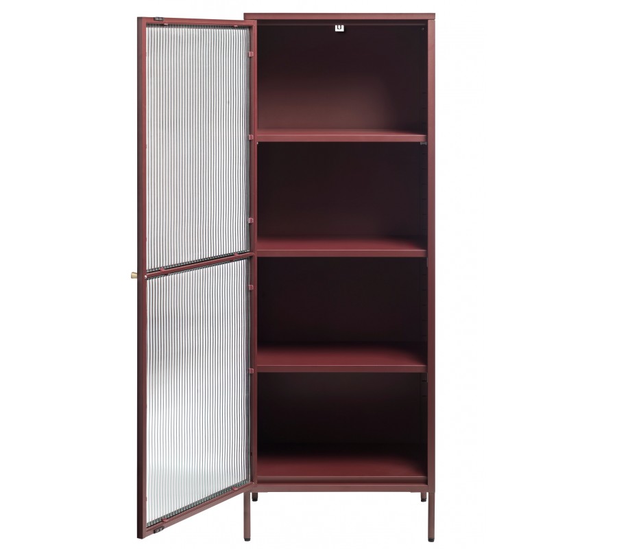 Moderná vitrína Farver v tehlovočervenom prevedení predstavuje výrazný dizajnový prvok s industriálnym nádychom. Kovová konštrukcia v sýtom červenom odtieni dodáva interiéru teplo a charakter, zatiaľ čo zlatá okrúhla úchytka prináša jemný elegantný kontrast.