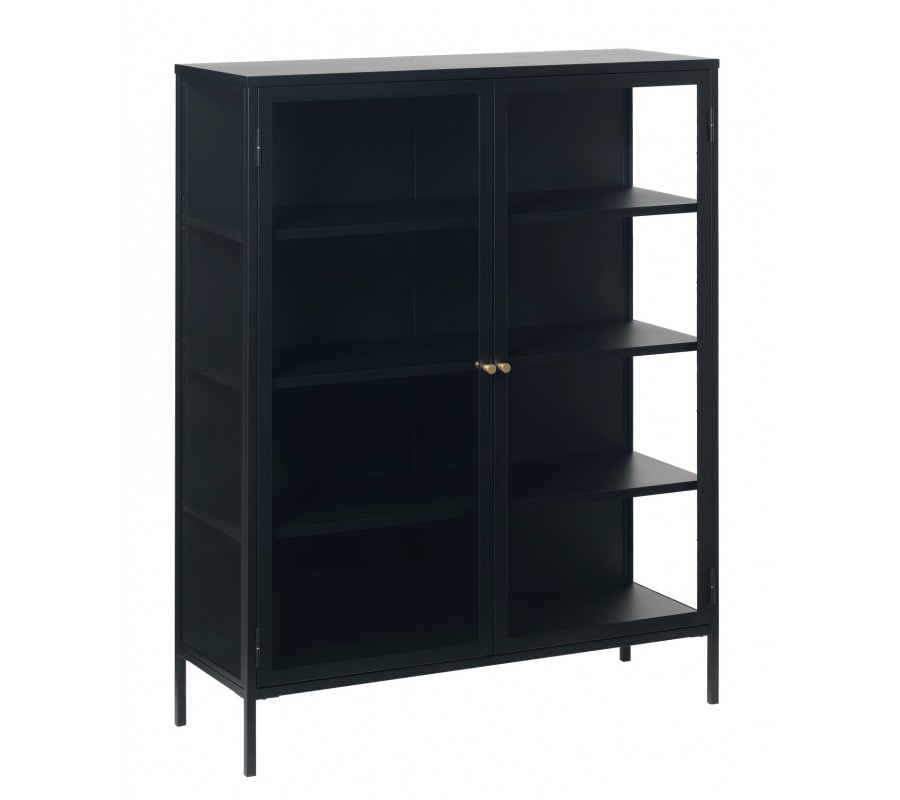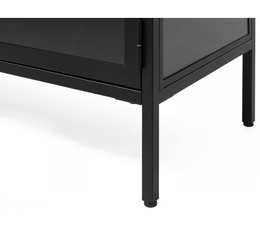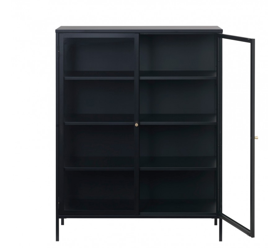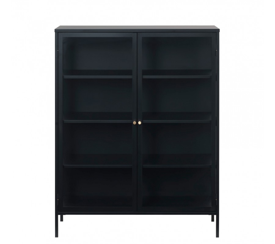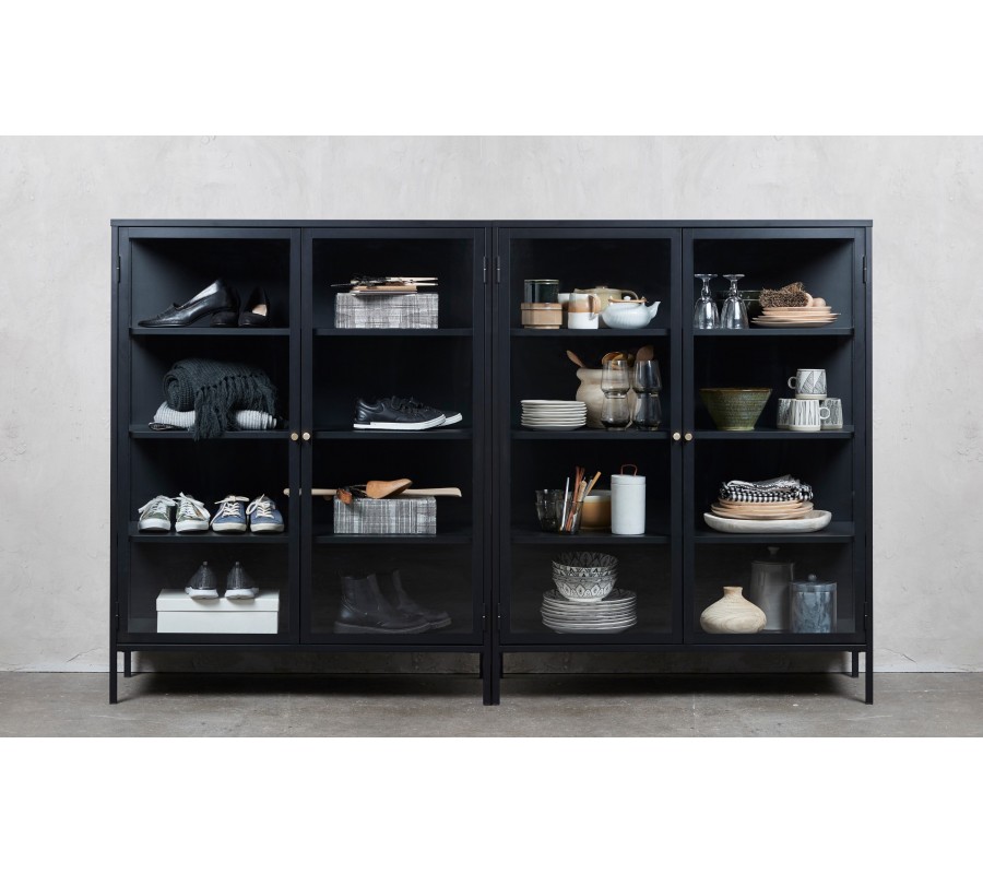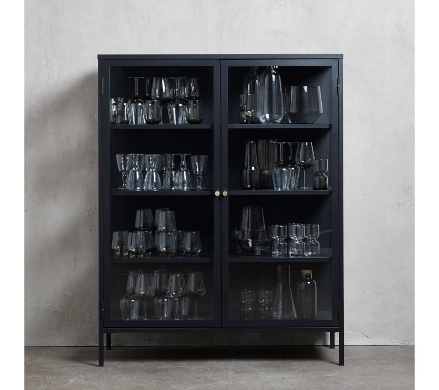 Vitrína má modernú lineárnu siluetu. Mohutný úložný priestor je postavený na štyroch štíhlych nožičkách, ktoré jej v spojení s priehľadnými výplňami z bezpečnostného skla dodávajú odľahčený vzhľad. Je vyrobená z kovu v matnej čiernej farbe, zvýrazňujúcej jej moderný minimalistický charakter. Okrúhle úchytky v lesklom zlatom prevedení tvoria elegantný kontrastný akcent.