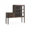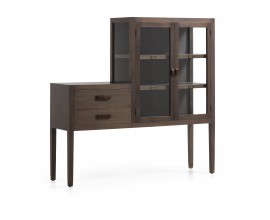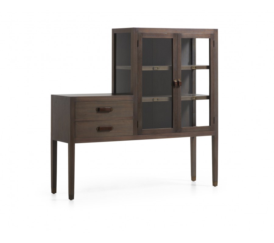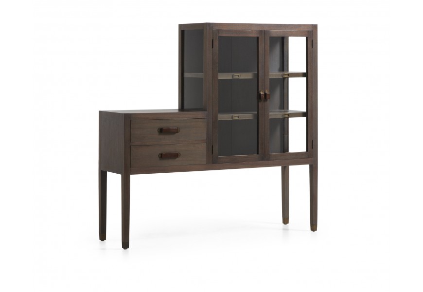 Luxusná dizajnová vitrína z kolekcie nábytku SPARTAN je vyrobená z masívneho dreva MINDI, hnedo-modro-čierneho výrazu, podobného drevu WENGE. Štýl kolekcie odrzkadluje sedemdesiate roky. Tento nábytok v RETRO štýle má úchyty z tvrdej kože hnedej farby.