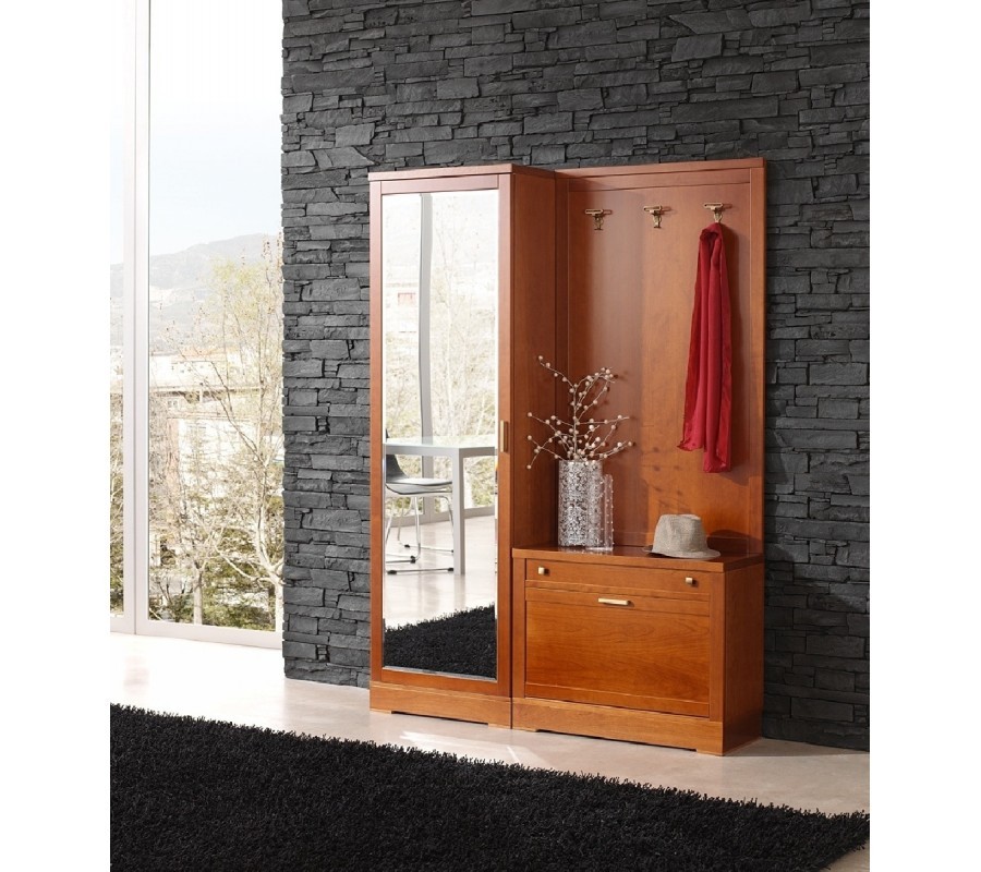 Luxusná zostava do predsiene z kolekcie Carmen predstavuje nábytok rustikálneho štýlu doplnený o prvky moderného dizajnu. Táto kombinácia vďaka svojej jednoduchosti oživí ako klasickejšie interiéry, tak aj moderne zariadené priestory a navodí v nich príjemnú atmosféru domova. Zostava Carmen je vyrobená z masívneho dreva chráneného dyhou, ktorého prirodzená štruktúra je zvýraznená povrchovou úpravou. Zostavu je možné vyrobiť v prevedení orech a čerešňa, podľa vzorkovníka. Rukoväte a vešiaky sú vyrobené z kovu zlatej farby a vytvárajú tak príjemný kontrast s masívnym drevom. Zostava sa skladá z úzkej šatníkovej skrinky so zrkadlom o rozmere 60 cm, zásteny s tromi vešiakmi a dreveného botníka so zásuvkou. Zostavu Carmen odporúčame umiestniť do svetlejších interiérov, no krásne vynikne napríklad aj s tmavým kobercom, či dekoráciami metalických farieb ako je zlatá, strieborná alebo bronzová.