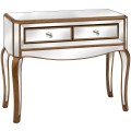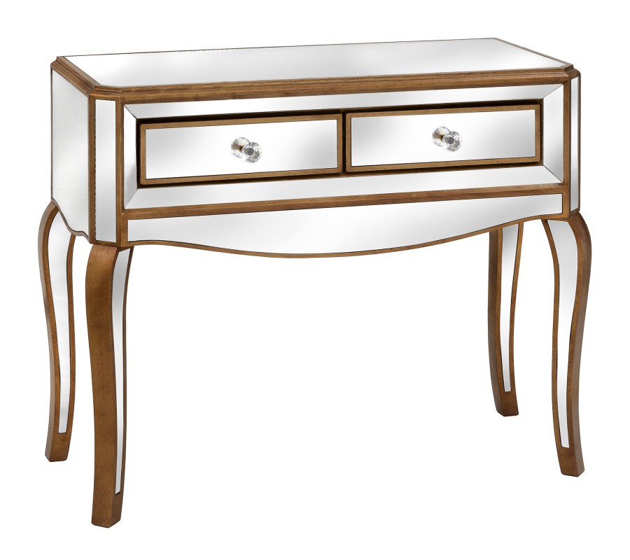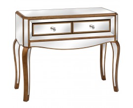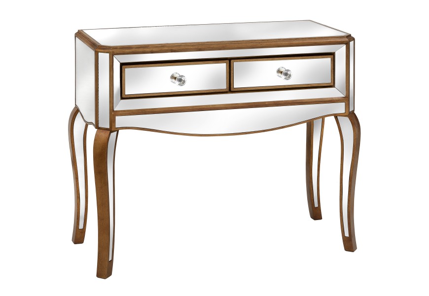 Luxusná zrkadlová konzola s dvoma zásuvkami sa zaručene stane pútačom pozornosti v každej miestnosti. Zlatistá farba dreva, veľké zrkadlové plochy odrážajúce svetlo spolu s krištáľovými úchytkami zásuviek z nej robia neprehliadnuteľný a luxusný kúsok. Pozrite sa na ďalšie kúsky z kolekcie špecifického zrkadlového nábytku, ktorý ozvláštni a presvetlí váš interiér.