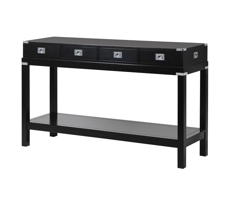Moderná luxusná konzola Wielton Nero obdĺžnikového tvaru je vyrobená z dreveného masívu v čiernej farbe. Ponúka štyri zásuvky, ktoré dopĺňajú strieborné, kovové rúčky. Hodí sa do moderne zariadených interiérov. Vhodná je na odloženie vašich drobnosti do niektorej z jej štyroch zásuviek. Doporučujeme na nej vystaviť štýlovú dekoráciu v podobe vázy s kvetmi, prípadne ju doplniť s nástenným zrkadlom v tmavom čiernom ráme. V priestore vďaka kombinácii čiernej so striebornou pôsobí dominantne a luxusne.