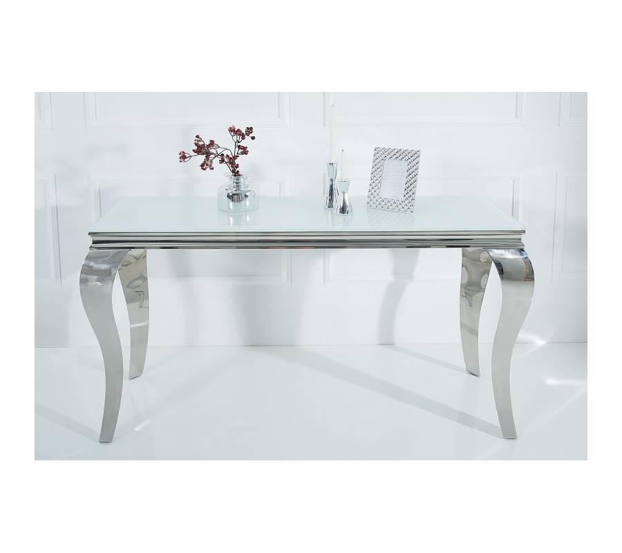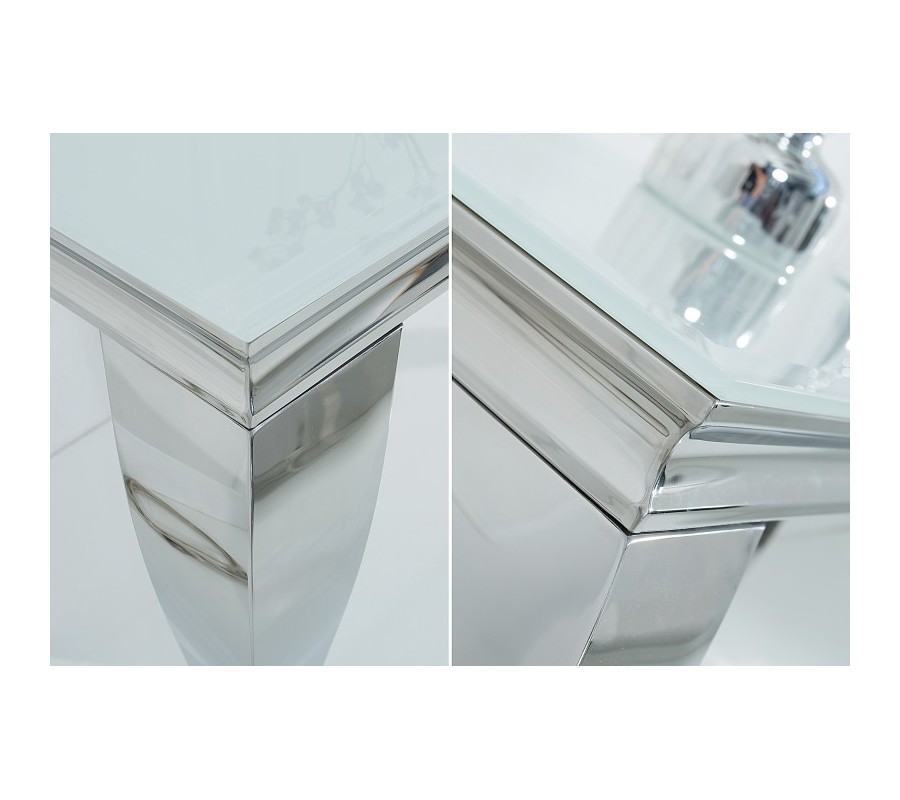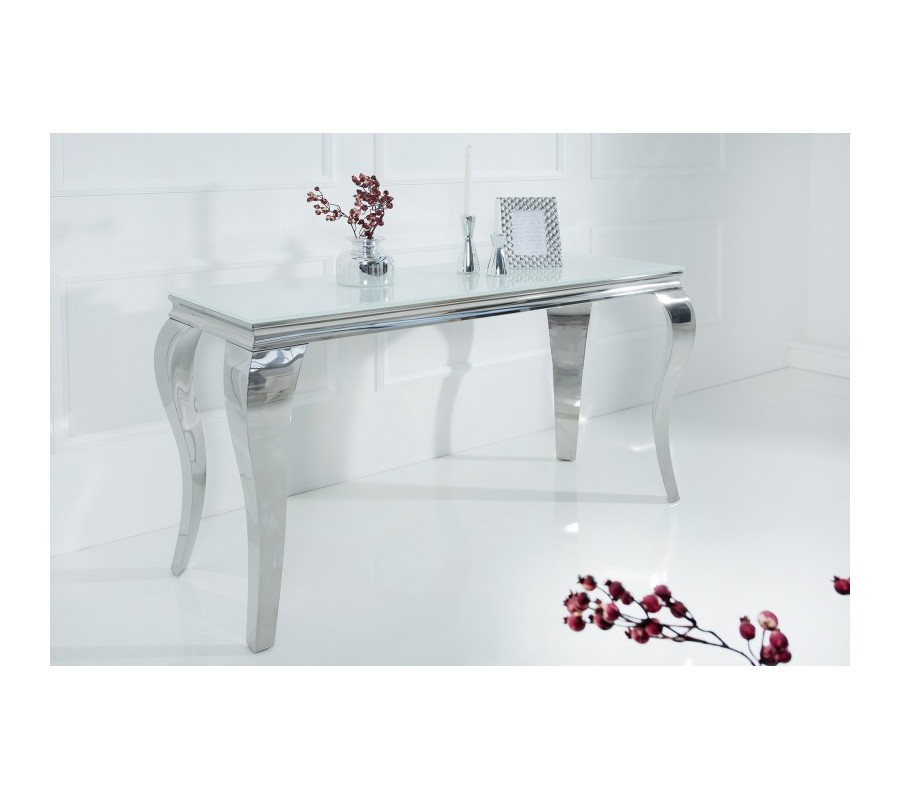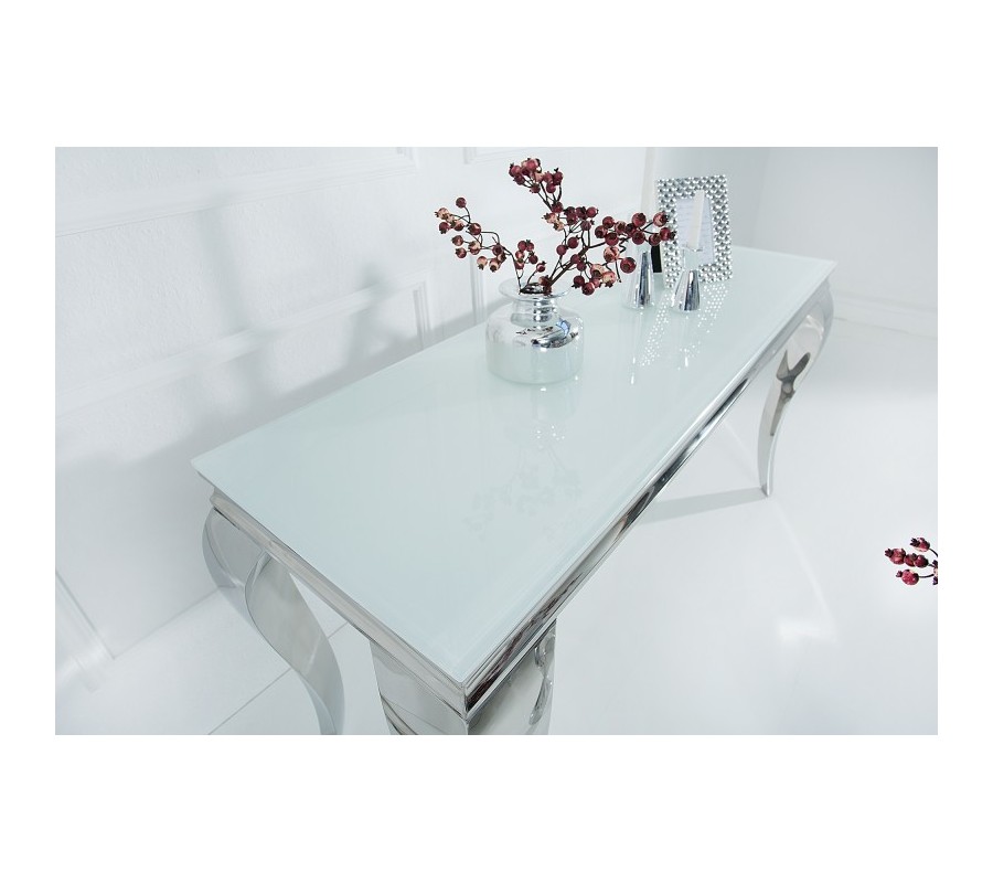 Luxusná biela konzola Modern Barock je jedinečným doplnkom do moderne zariadených interiérov. Kombinácia lešteného nerezu s bielou vrchnou doskou o sile 10mm dodáva konzole osobitosť a eleganciu. Materiál: leštená nerezová oceľ, tvrdené sklo.