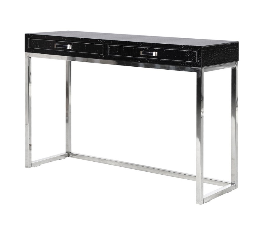 Moderný konzolový stolík Dandee III na kovových nožičkách so zásuvkami a koženým čiernym poťahom s krokodílovým vzorom 110cm