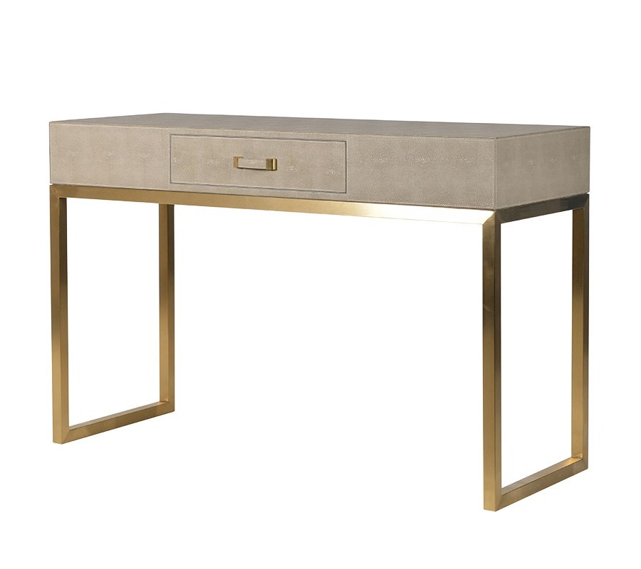 Konzolový stolík v Art-deco štýle zaujme každého už na prvý pohľad svojim minimalistickým tvarom a extravagantnými materiálmi. Konzolový stolík v tvare obdĺžnika sa skladá z konštrukčnej časti, ktorý je vyrobený z nehrdzavejúcej ocele v matnej zlatej farbe. Judnoduchá konštrukcia je doplnená o telo, ktoré je pokryté béžovou šagrénovou ekokožou a to mu dodáva jedinečný vzhľad a čaro. Šagrénovou kožou sa označuje typicky žraločia koža používaná ako dekoratívny materiál najmä vďaka svojmu drsnému elegantne pôsobiacemu povrchu. Nesie sa v béžovej farbe s nádychom zelenej, a žltej. Stolík tiež disponuje praktickou zásuvkou na uschovanie drobnejších predmetov. Konzolu odporúčame umiestniť do predsiení, ktoré sú zariadená v Art-deco, alebo modernom štýle. Konzolový stolík sa hodí do svetlejších priestorov ako, béžová, alebo biela so zlatými bytovými doplnkami.