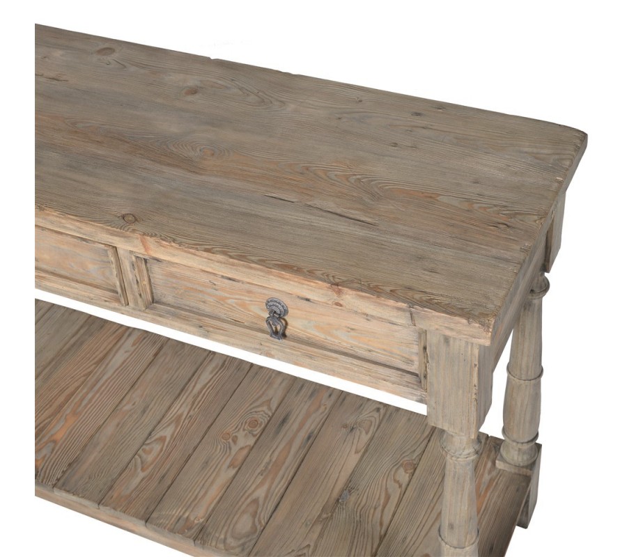 Koloniálny masívny konzolový stolík z kolekcie Kolonial je nádherným dizajnovým kúskom, ktorý sa pýši kvalitným masívnym vyhotovením, čo je doplnené jemným vyrezávaním. Dizajnová konzola Kolonial je vyrobená z recyklovaného borovicového masívu, vďaka ktorému si získava trvácnosť a odolnosť proti vlhkosti. Povrch dreva je chránený aj povrchovou úpravou, vďaka ktorej si konzola Kolonial získava svoj vintage ošúchaný vzhľad a naturálny dizajn vo vidieckom štýle. Historický vintage vzhľad recyklovaného dreva je doplnený ručne vyrezávanými dekoratívnymi nožičkami, ktoré svojím vzhľadom vytvoria nádych rustikálneho štýlu. Praktická stránka konzoly Kolonial Vám ponúkne tri zásuvky s kovovými dekoratívnymi rukoväťami a taktiež otvorenú policu na spodnej časti stolíka. Masívny konzolový stolík Kolonial odporúčame kombinovať s podobným nábytkom z recyklovaného dreva, čo vytvára príjemný vintage efekt, alebo s masívnym nábytkom a drevenými dekoráciami pre vytvorenie vidieckeho štýlu vo Vašej predsieni.